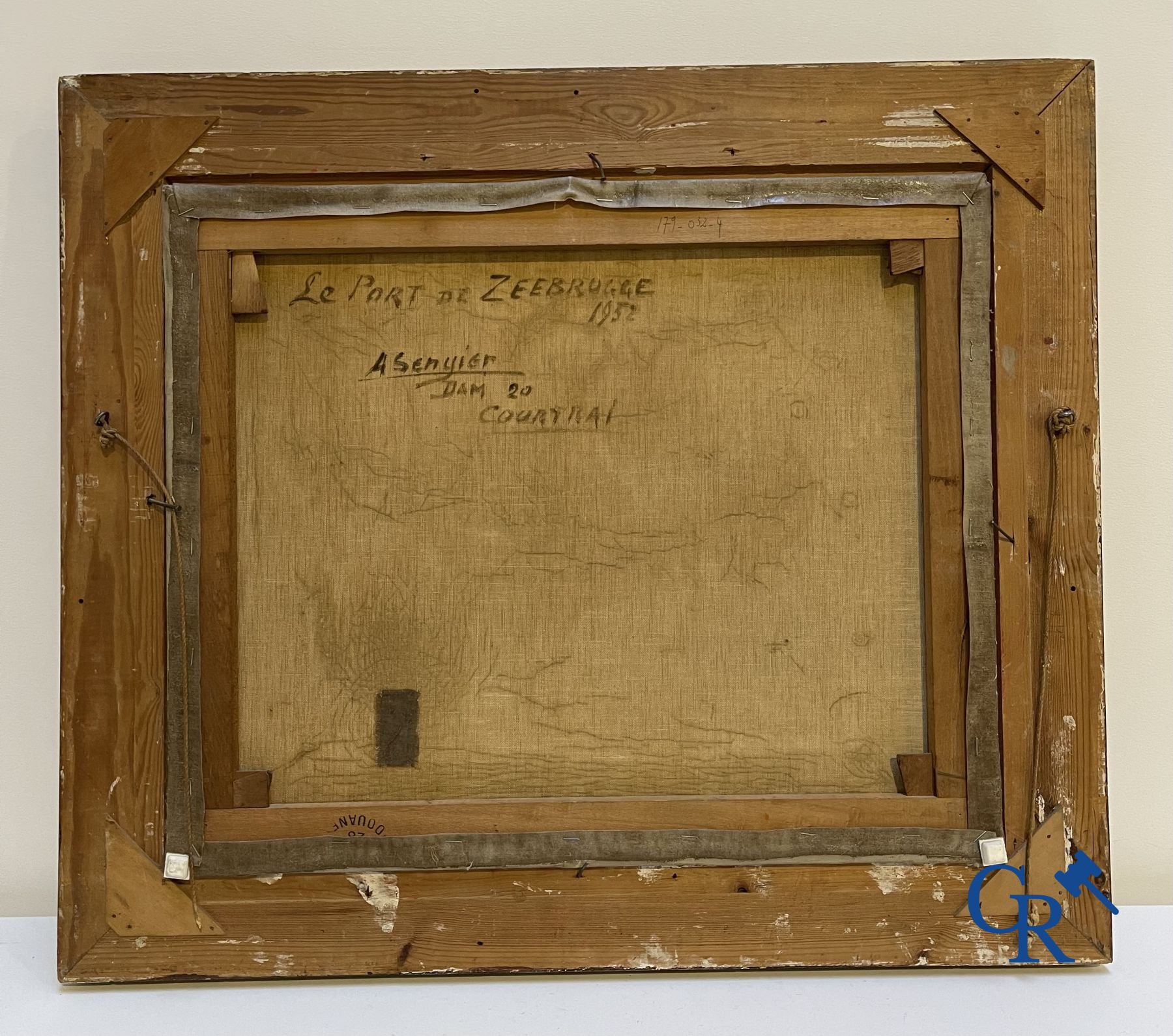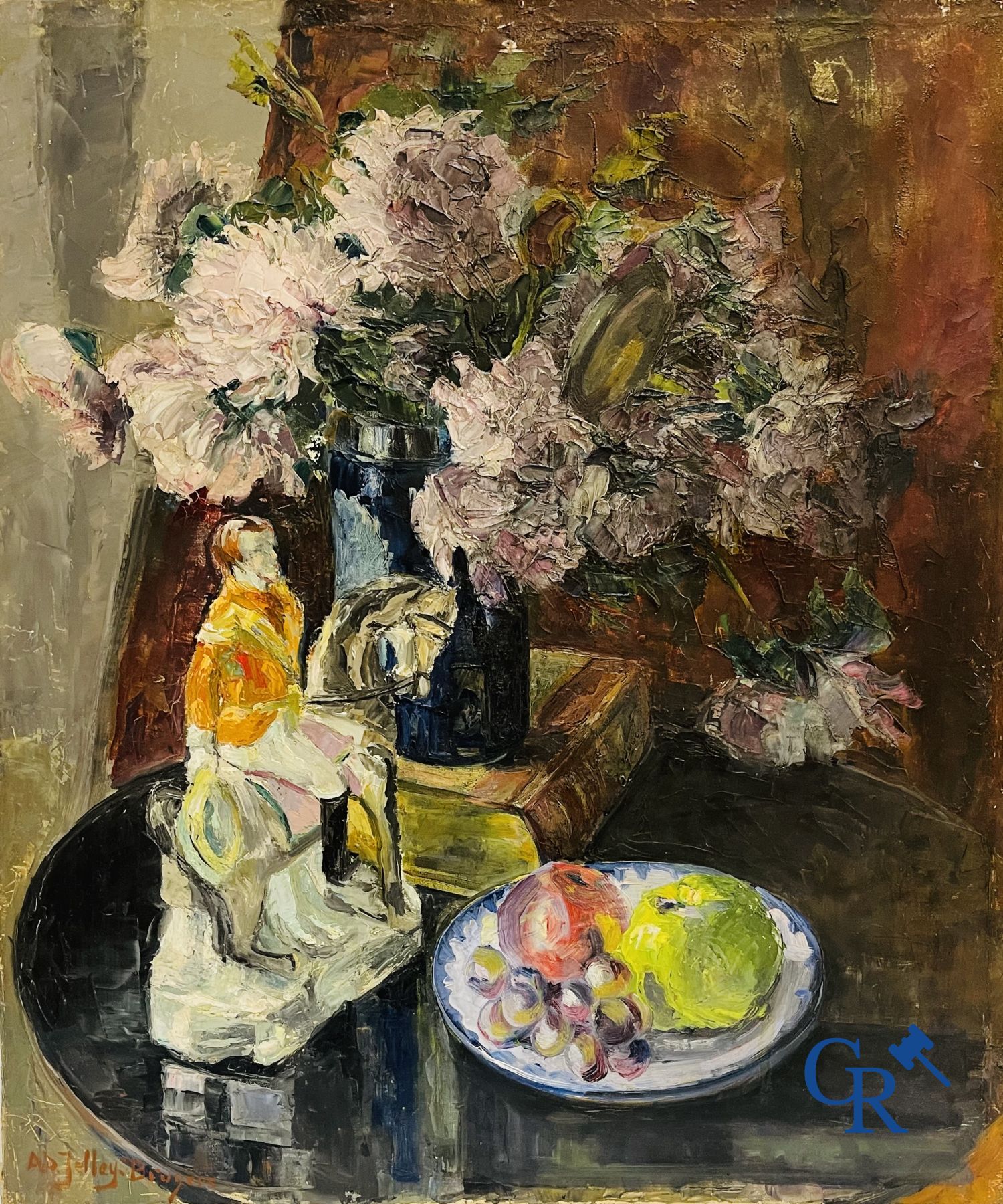 | 3 oil paintings. Oil on canvas: still life signed Adrienne Jelley-Bruyère, harbour view signed Achille Sengier. Oil on panel: Marine signed J. Ch. Schotel. |