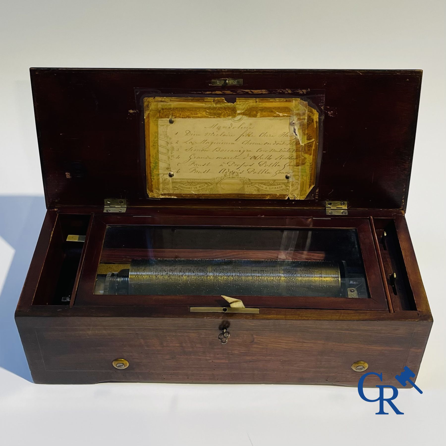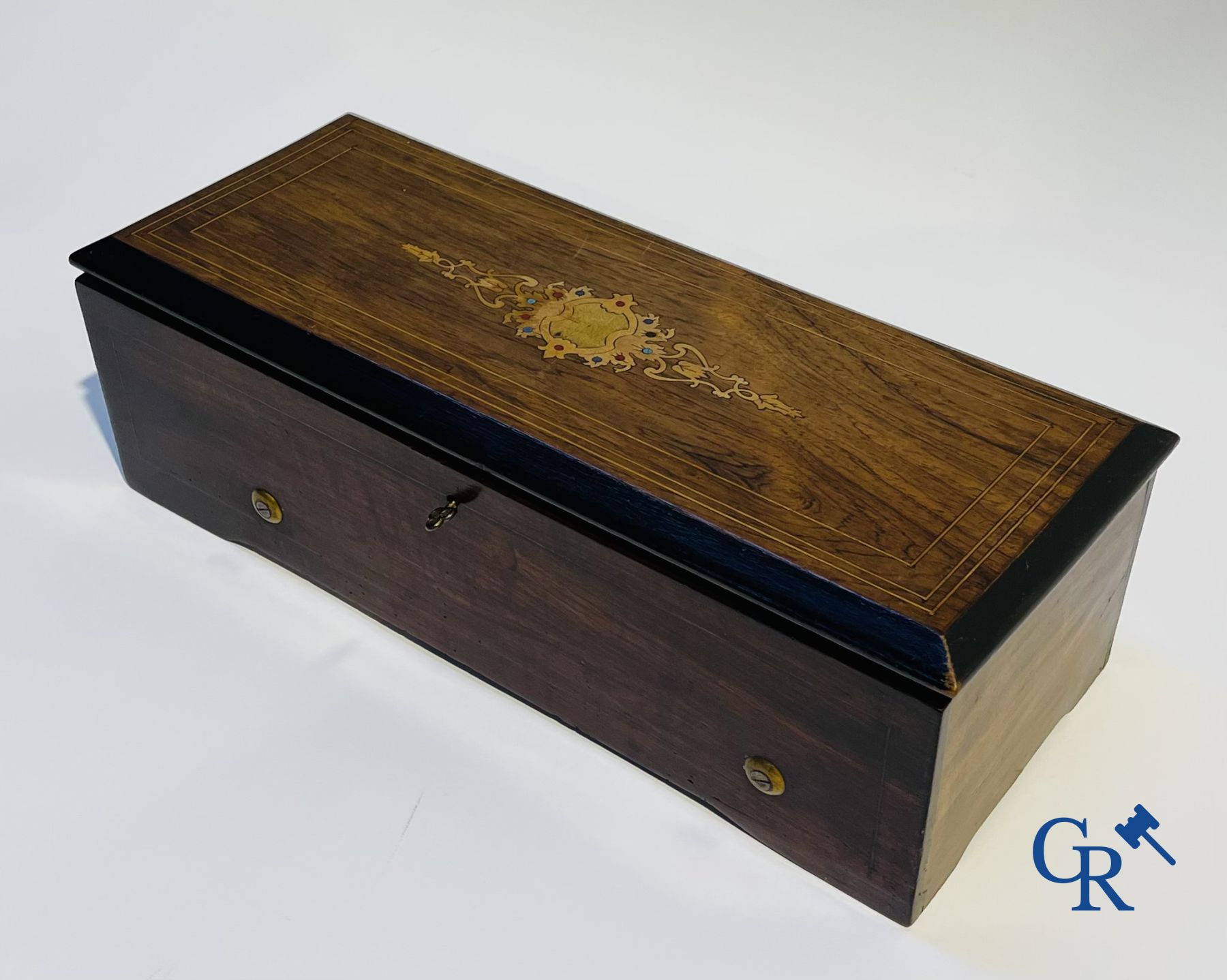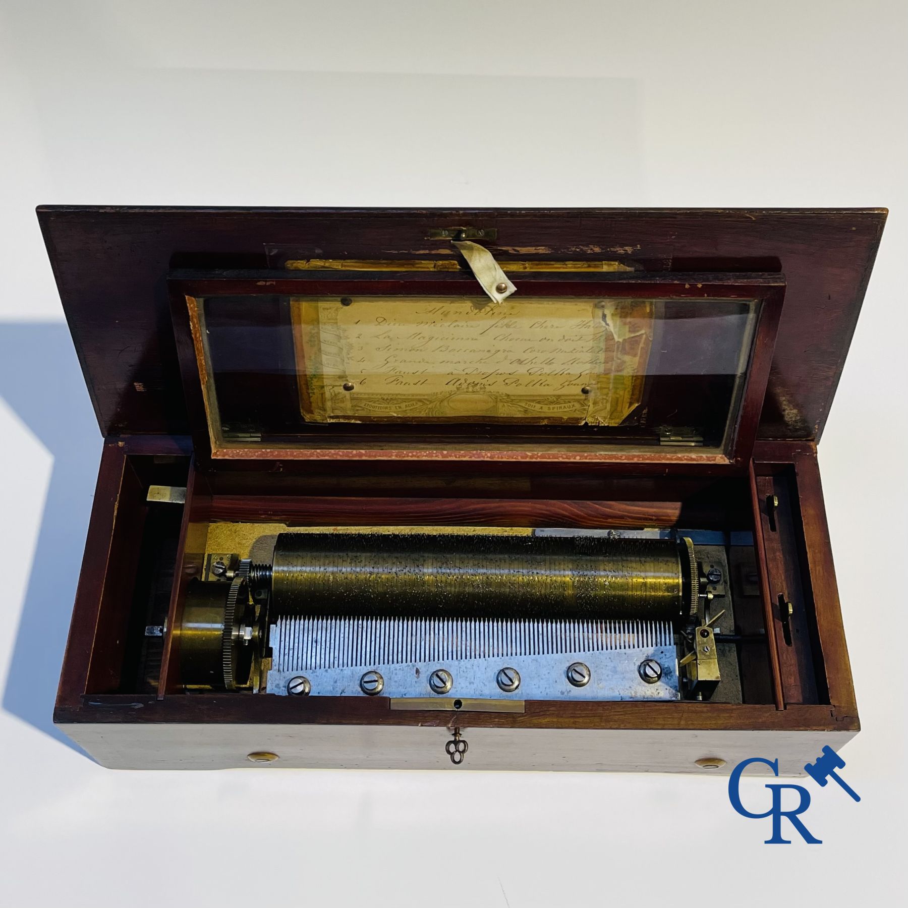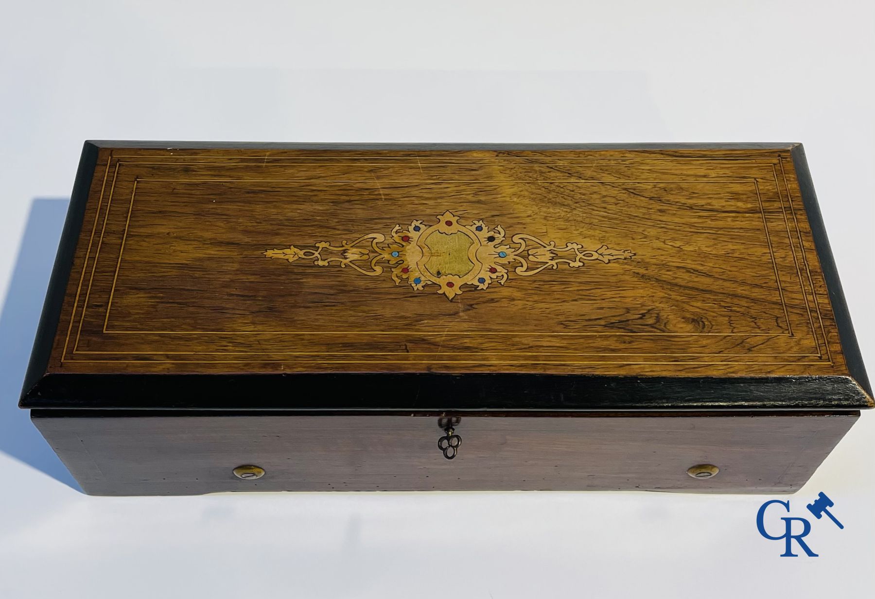 A music box in mahogany and marquetry with 6 melodies.