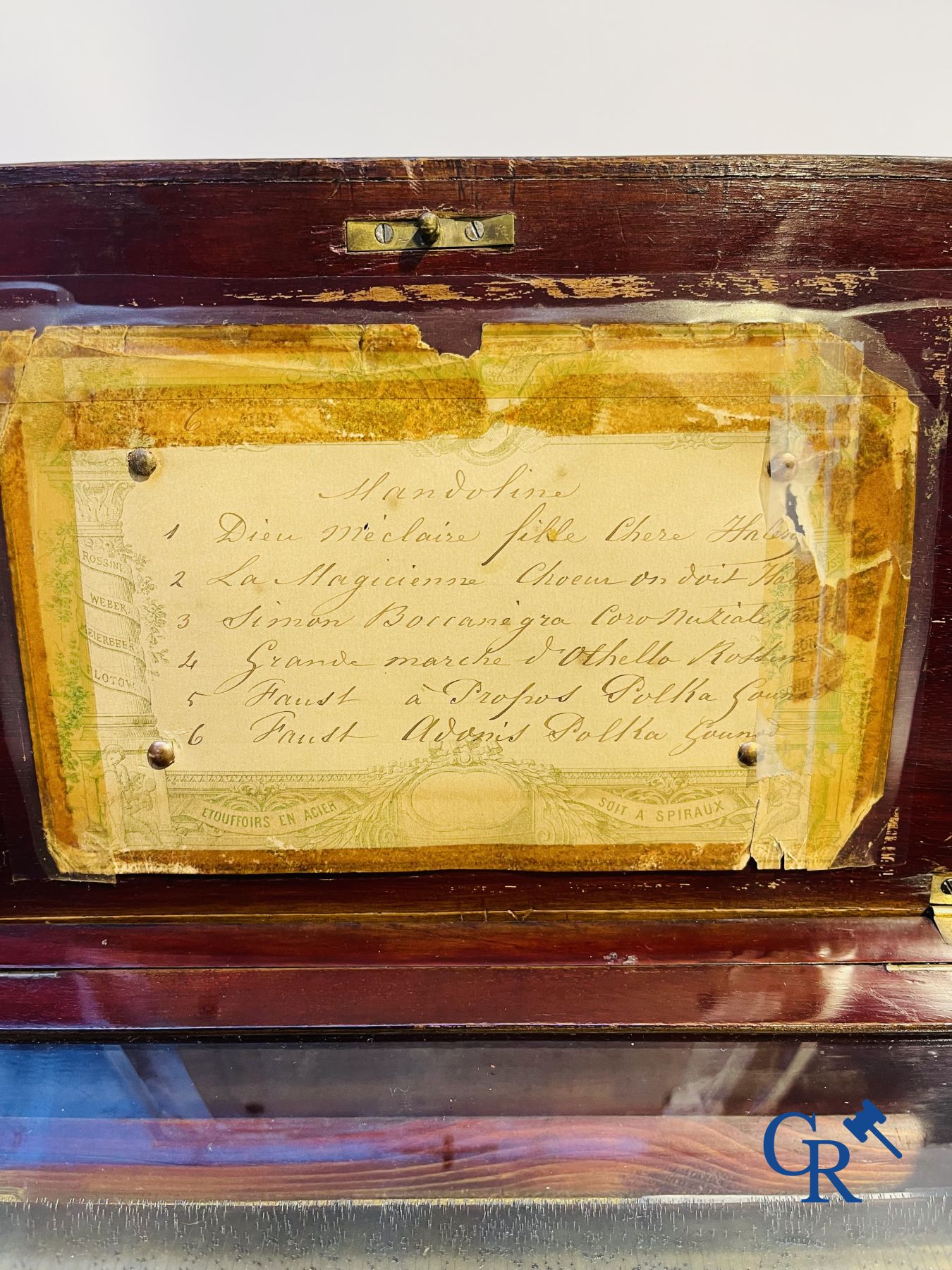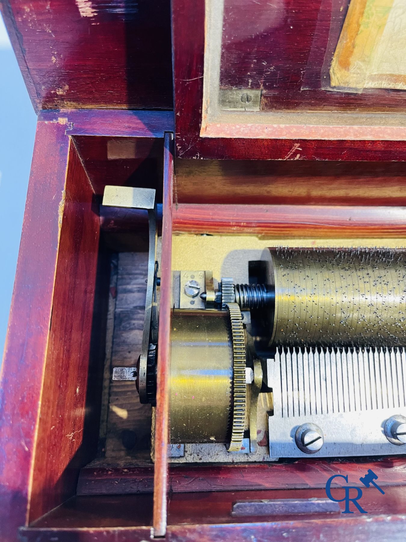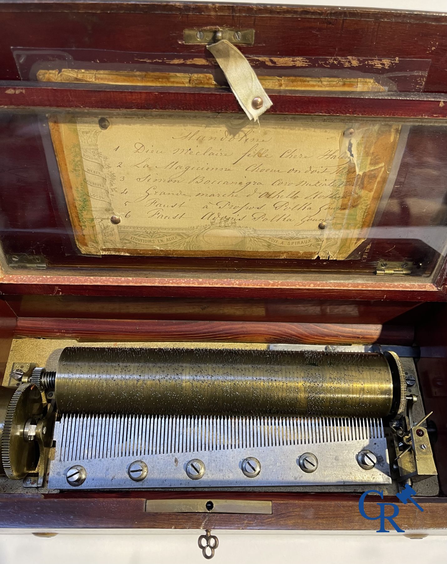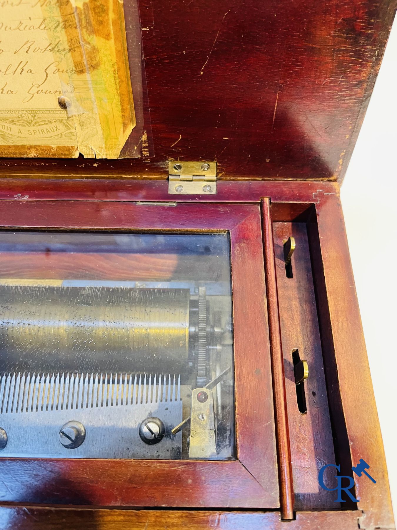 A music box in mahogany and marquetry with 6 melodies.