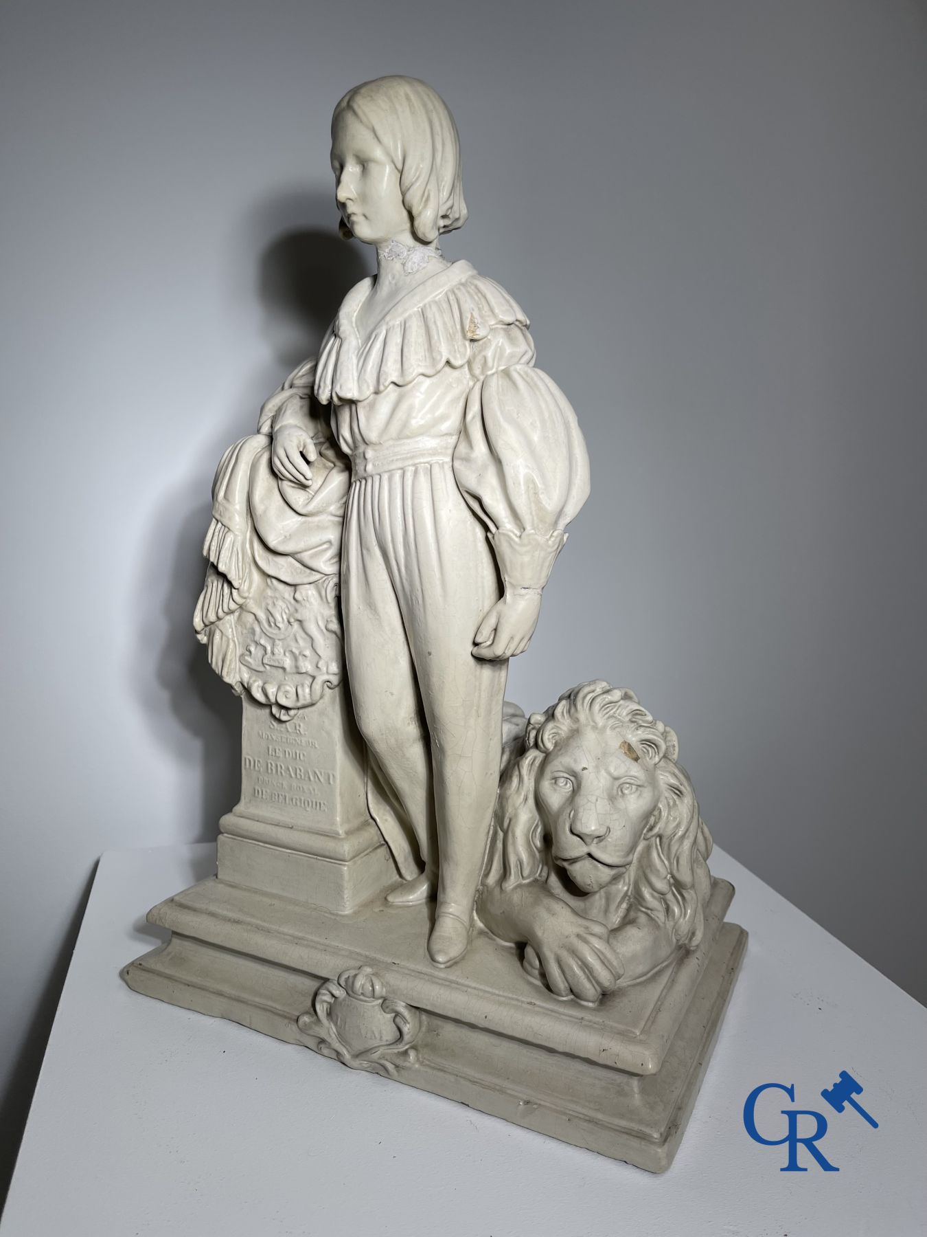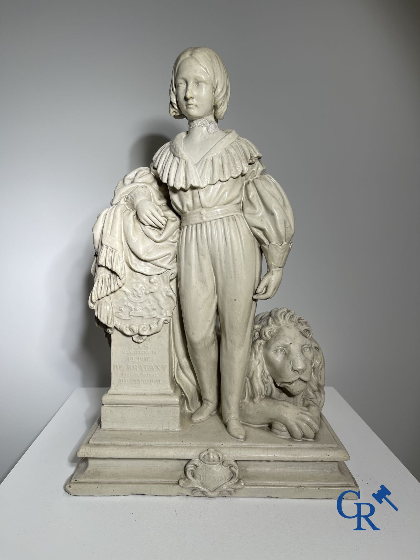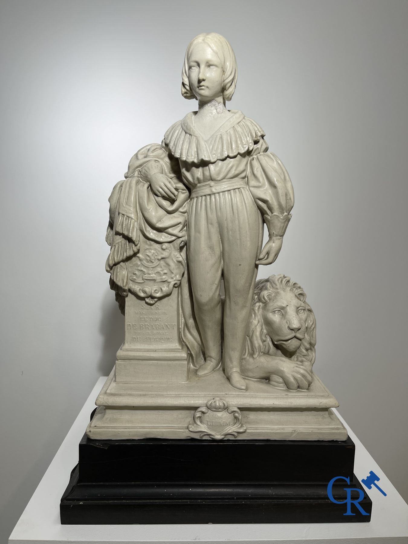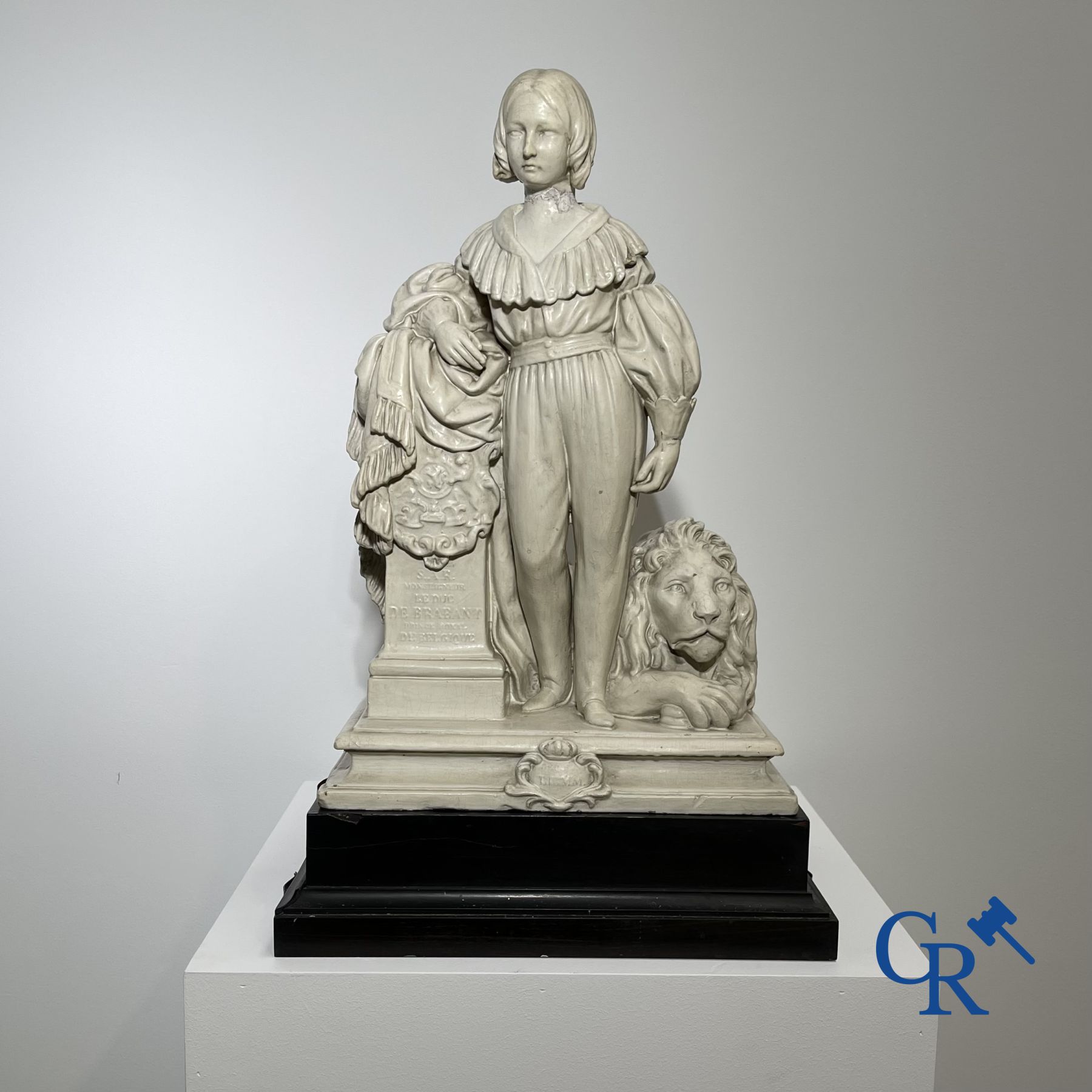 | Joseph Michel Ange Pollet. (Palermo - Italy 1814 - Paris 1871) Le Duc de Brabant. Portrait of Prince Leopold II (born on 9 April 1835) in plaster on an ebony veneer plinth. The Prince, accompanied by a long-haired lion (representing Brabant) with crossed legs, leans on a ermine cloak (the monarchy), which is located on a neoclassical pedestal with inscriptions on which the Coat of Arms of Belgium is attached. Joseph Pollet studies sculpture in Italy together with Bertel Thorwaldsen and Pietro Tenerani. He came to Paris in 1836, and stayed in Ghent in 1838. He resided again in Italy from 1843 to 1845, after which he settled permanently in Paris. He exhibited for the first time at the Paris Salon in 1846. Between 1847 and 1855, Pollet won several medals. The original plaster bust of Rubens made by Joseph Pollet in 1840 is in the possession of the Royal Museums of Fine Arts of Belgium. Several works by Pollet can be found in numerous museums and public places in Paris, Musée d'Orsay (maquette en plâtre pour le décor de l'opéra de Paris) Palais du Luxembourg (Achille et Déidamie) and Palais du Louvre pavillon Colbert (La navigation commerciale et la mécanique), Grenoble, musée de Grenoble (Une heure de la nuit), Orléans, musée des Beaux-Arts d'Orléans (L'impératrice Eugénie). At the front of the pedestal is stated: SAR - Monseigneur Le Duc De Brabant - Prince Royal De Belgique On the left: Deposé à Bruxelles - 10 July 1841 - Randon Editeur signed at the bottom J. Pollet (old restorations and repaintings) |