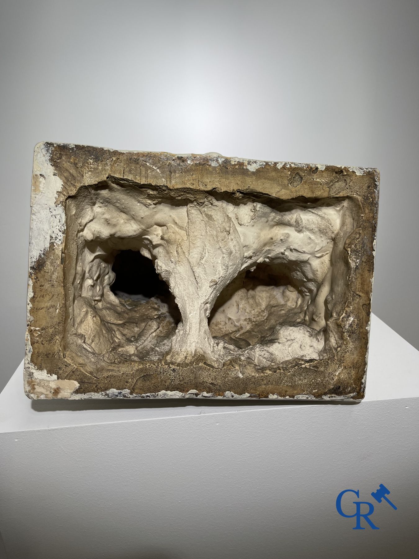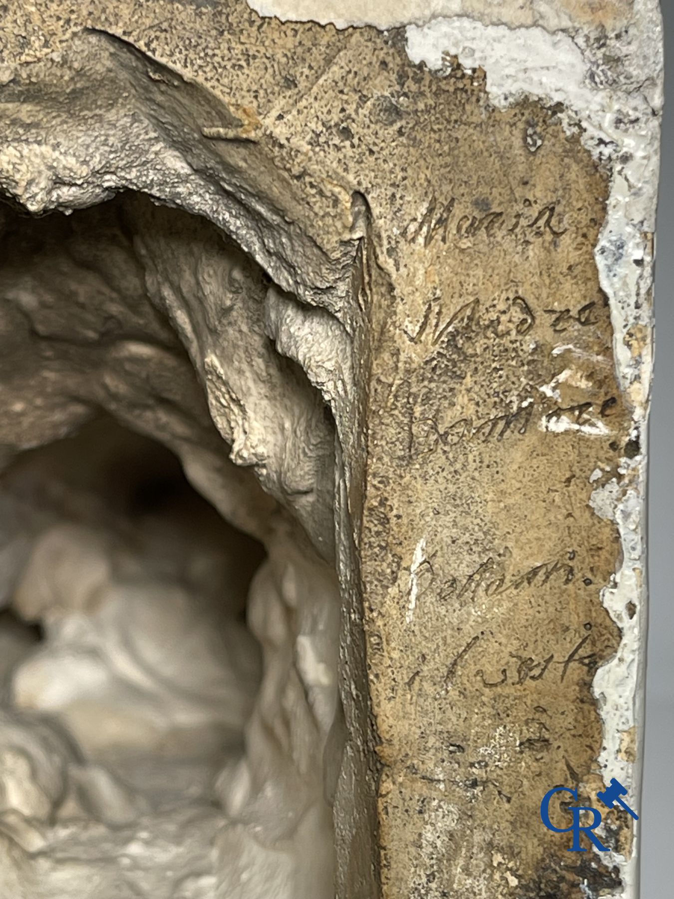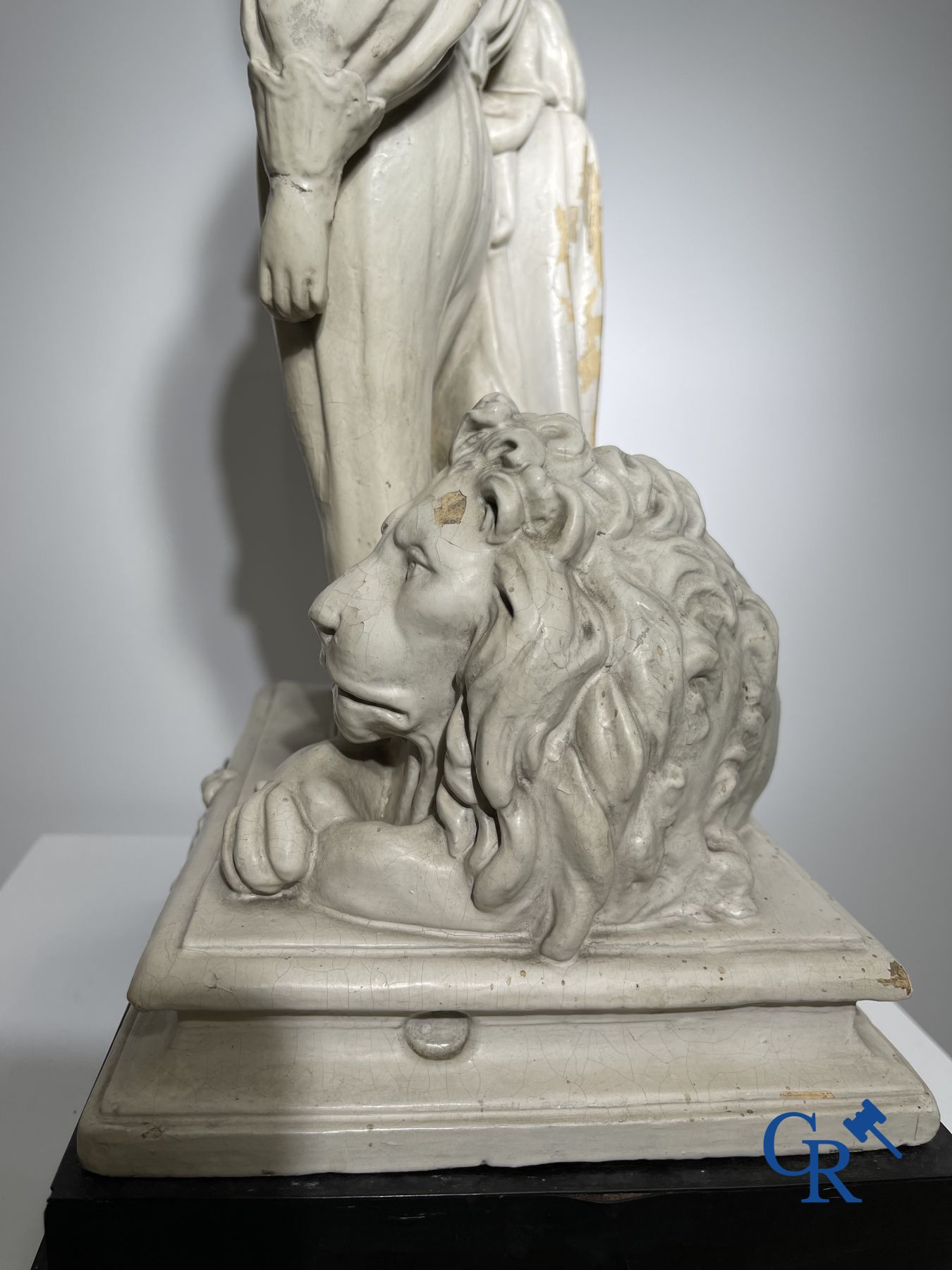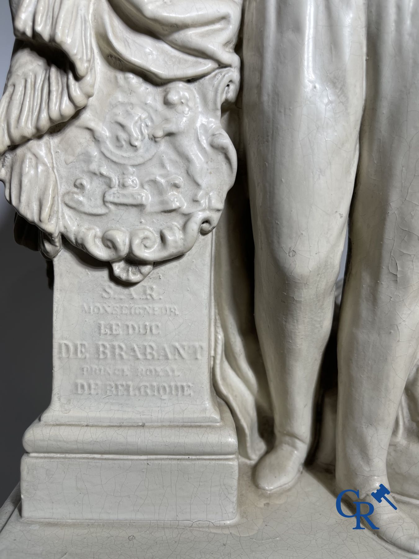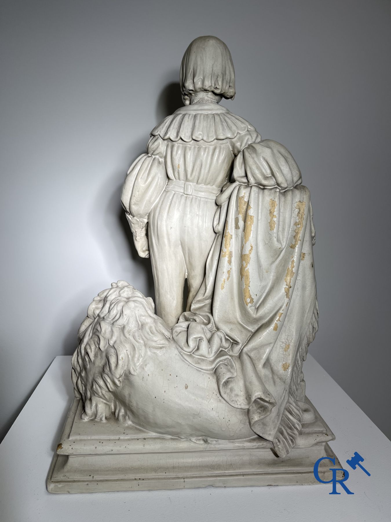 | Joseph Michel Ange Pollet. (Palermo - Italy 1814 - Paris 1871) Le Duc de Brabant. Portrait of Prince Leopold II (born on 9 April 1835) in plaster on an ebony veneer plinth. The Prince, accompanied by a long-haired lion (representing Brabant) with crossed legs, leans on a ermine cloak (the monarchy), which is located on a neoclassical pedestal with inscriptions on which the Coat of Arms of Belgium is attached. Joseph Pollet studies sculpture in Italy together with Bertel Thorwaldsen and Pietro Tenerani. He came to Paris in 1836, and stayed in Ghent in 1838. He resided again in Italy from 1843 to 1845, after which he settled permanently in Paris. He exhibited for the first time at the Paris Salon in 1846. Between 1847 and 1855, Pollet won several medals. The original plaster bust of Rubens made by Joseph Pollet in 1840 is in the possession of the Royal Museums of Fine Arts of Belgium. Several works by Pollet can be found in numerous museums and public places in Paris, Musée d'Orsay (maquette en plâtre pour le décor de l'opéra de Paris) Palais du Luxembourg (Achille et Déidamie) and Palais du Louvre pavillon Colbert (La navigation commerciale et la mécanique), Grenoble, musée de Grenoble (Une heure de la nuit), Orléans, musée des Beaux-Arts d'Orléans (L'impératrice Eugénie). At the front of the pedestal is stated: SAR - Monseigneur Le Duc De Brabant - Prince Royal De Belgique On the left: Deposé à Bruxelles - 10 July 1841 - Randon Editeur signed at the bottom J. Pollet (old restorations and repaintings) |