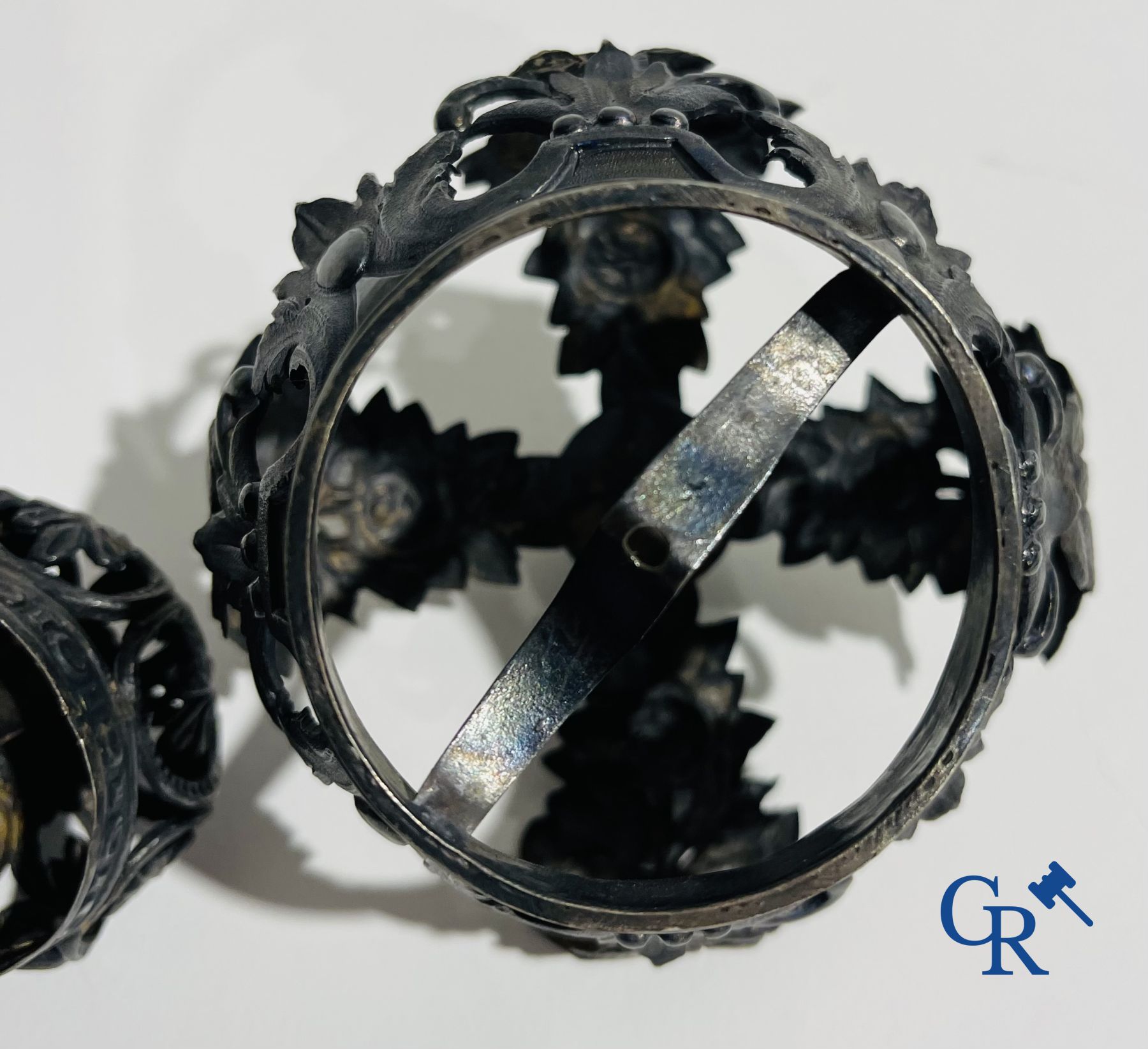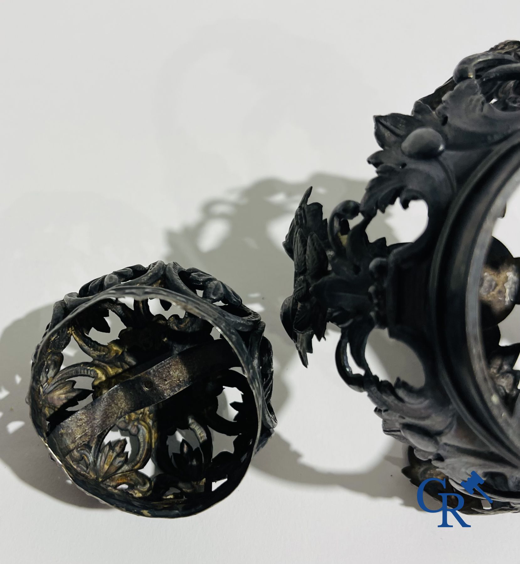 | Silver: A lot with silver cutlery, 2 silver crowns and a silver candlestick. Weight silver: 1,100 kg. A lot of metal silver-plated cutlery. Weight of silver-plated metal: 0,820 kg. |
