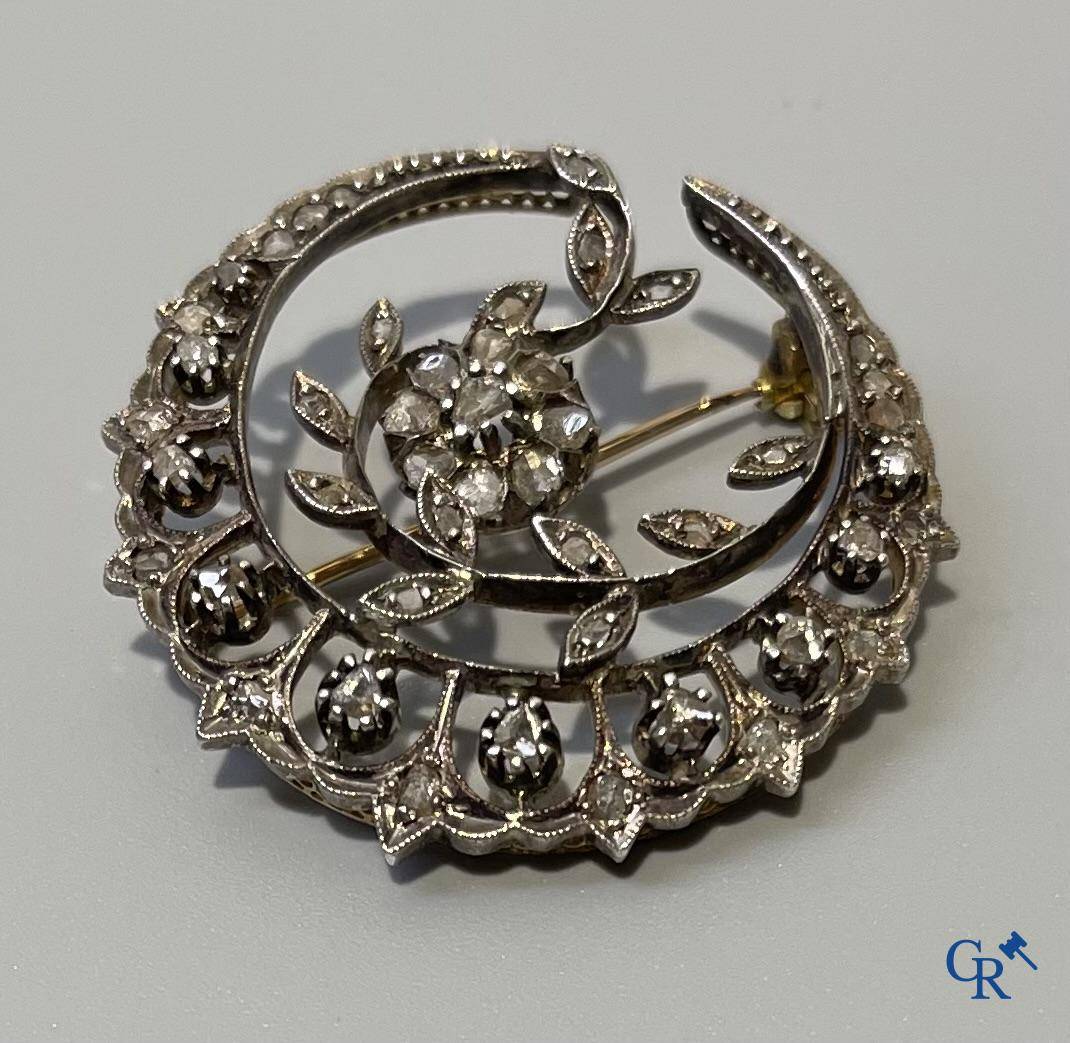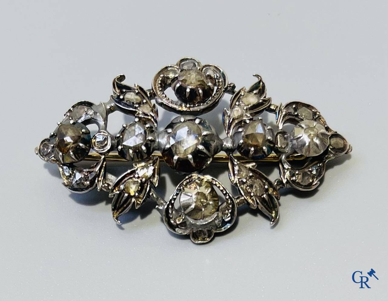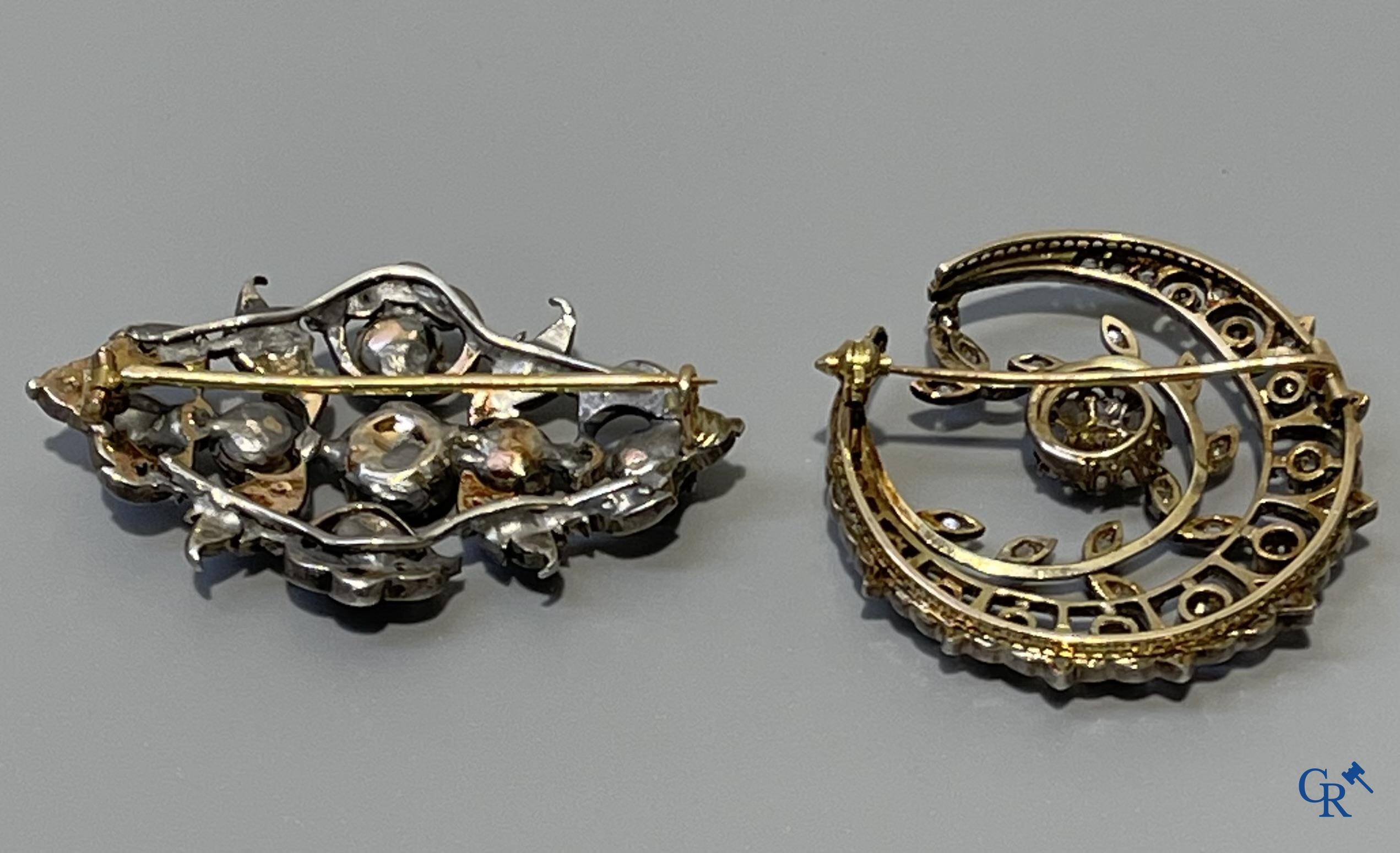 Bijoux, 2 broches en or 750 °/00 et argent serti de diamants, taille ancienne. Plus grande pierre +- 0,5 ct.