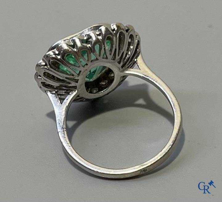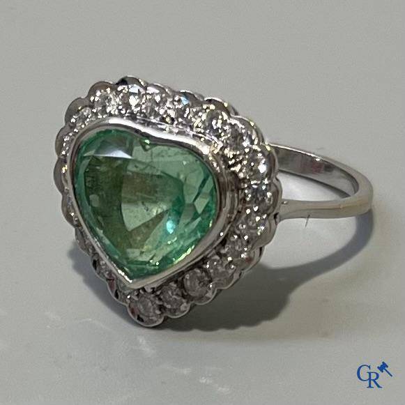 | Bijoux, une bague en forme de cœur en or blanc 750°/00 sertie de petits diamants et d'une émeraude. |