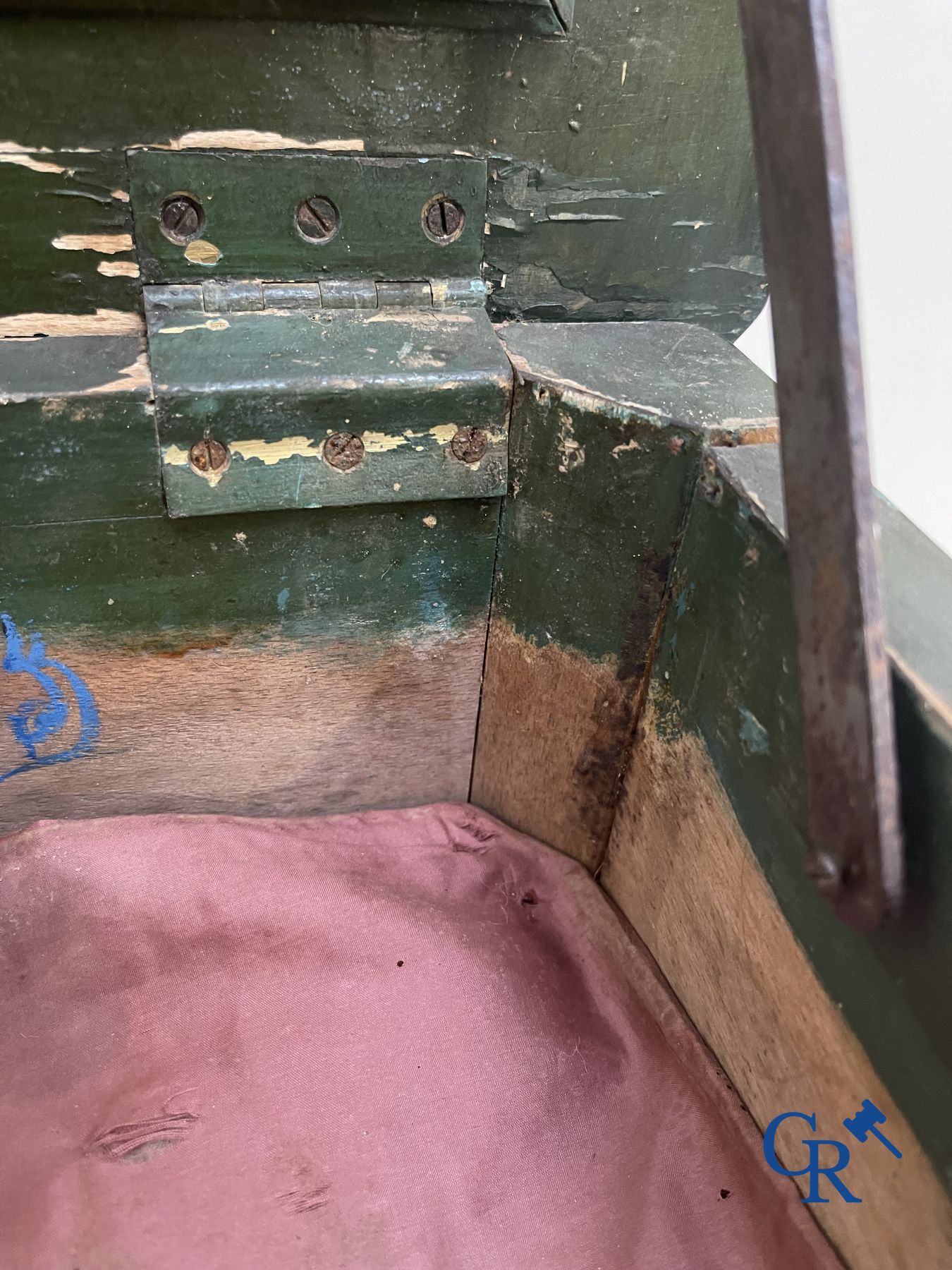 | Coiffeuse de dames (Poudreuse) peinte de scènes galantes, on y joint un fauteuil en cabriolet lacqué d'époque transition Louis XV - Louis XVI. |