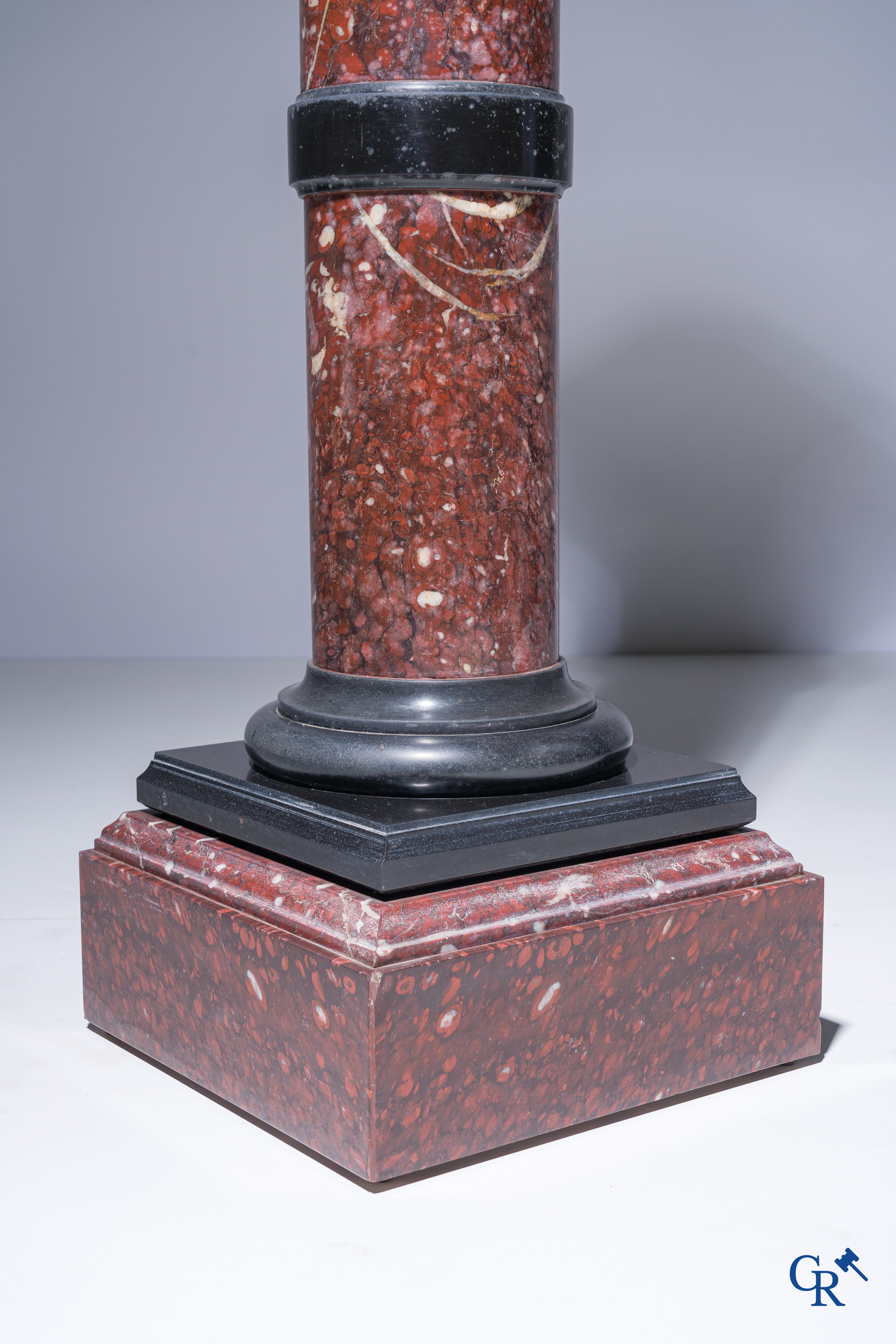 | Un piédestal en marbre belge veiné noir et rouge avec plateau pivotant. Vers 1930. |