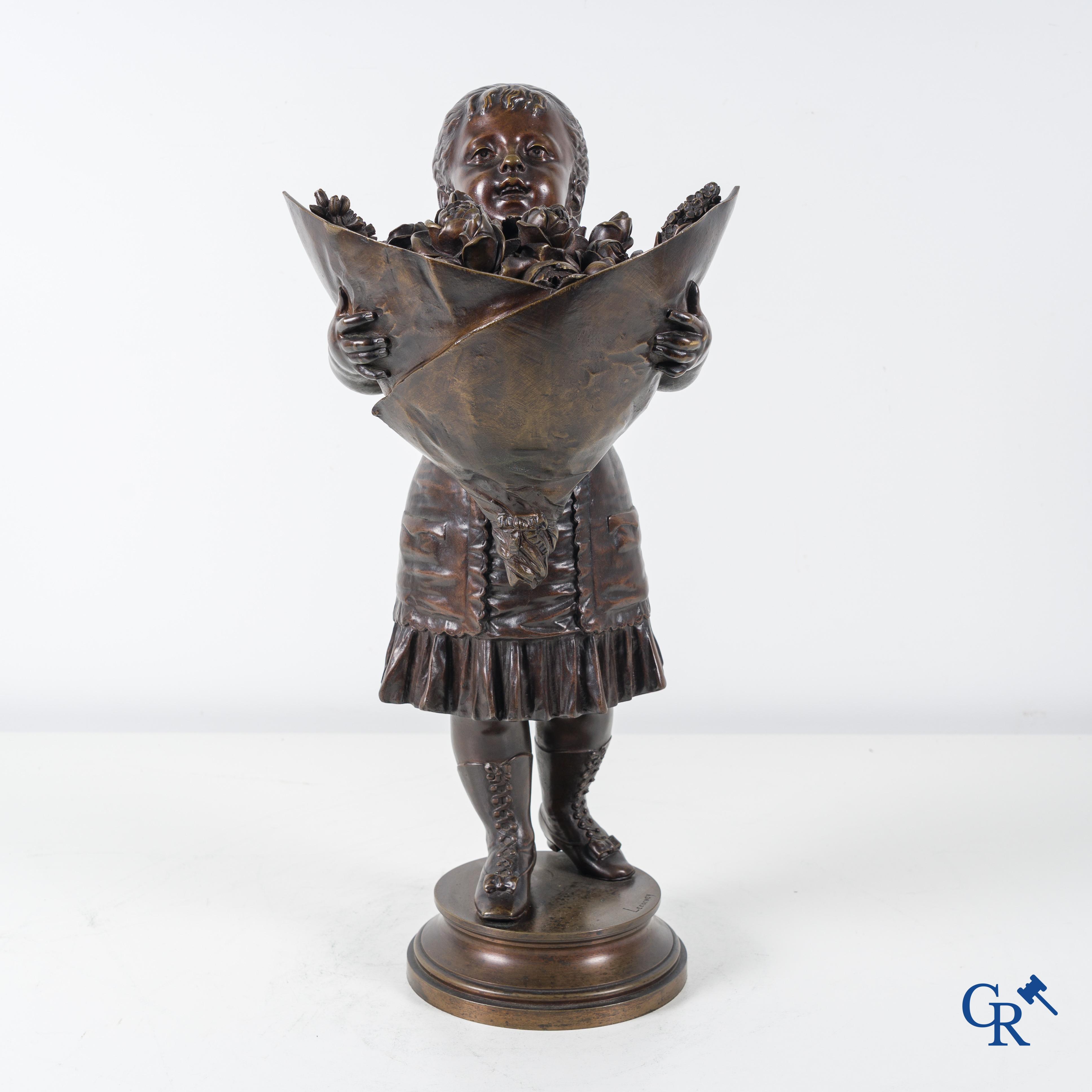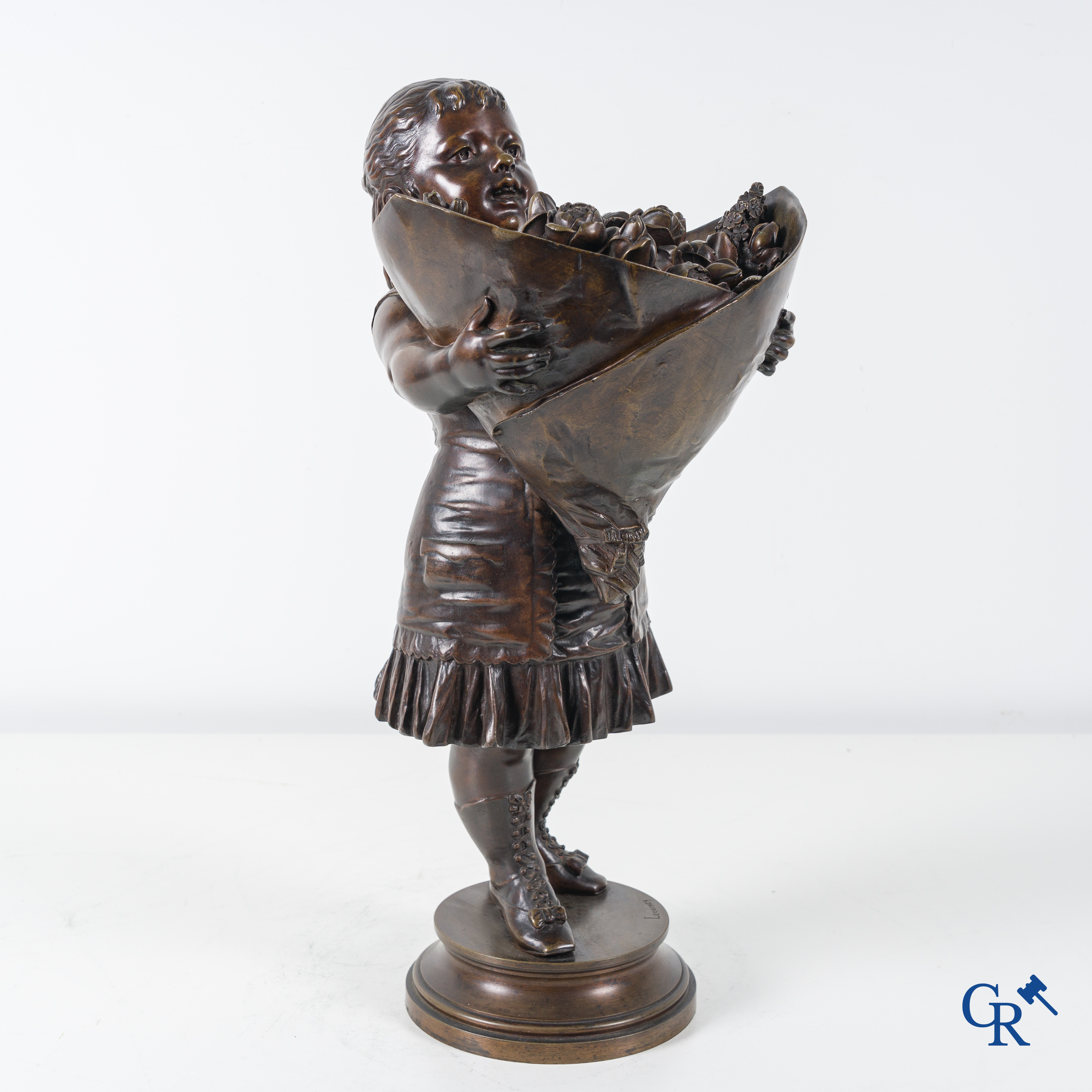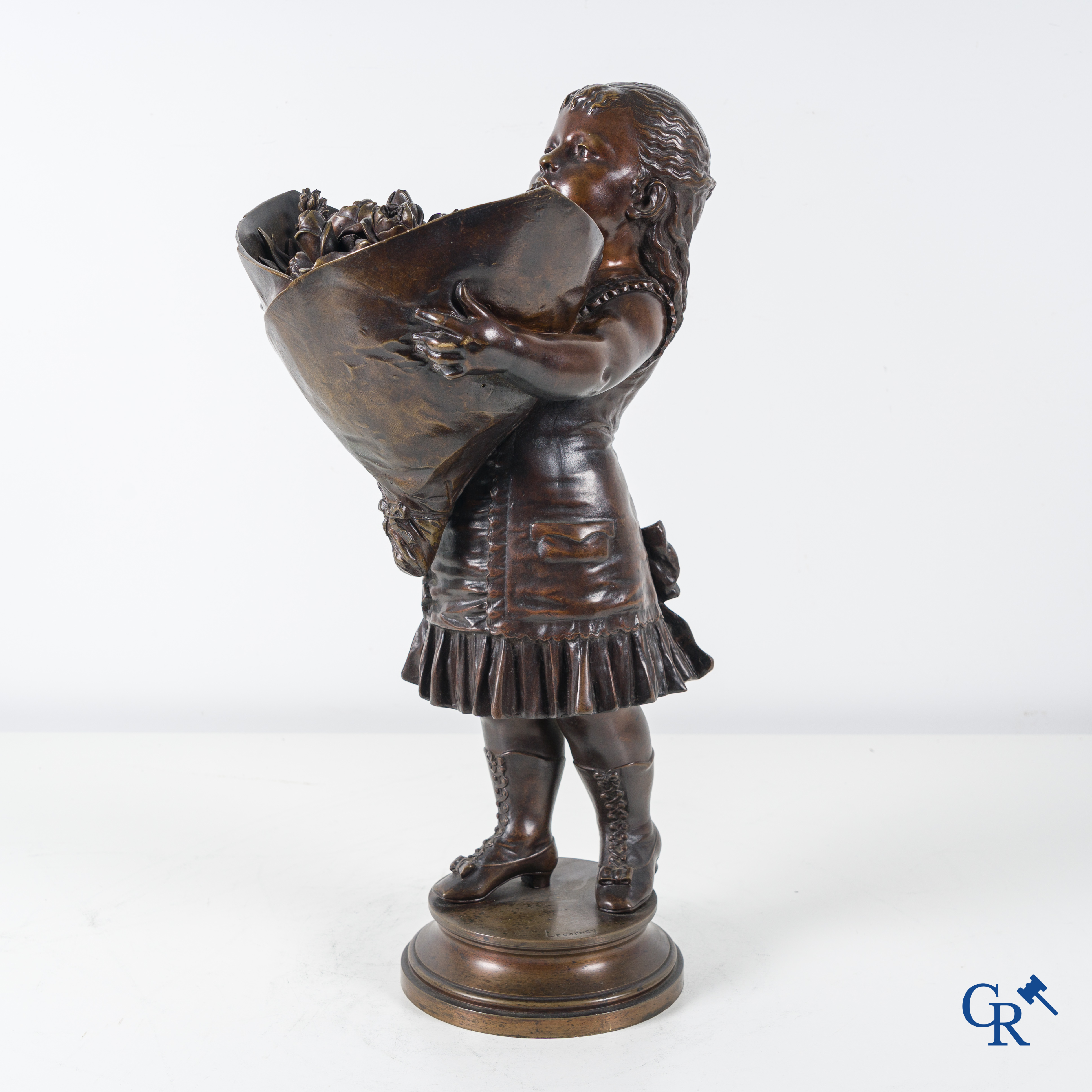 | Nicolas Lecorney, petite fille en bronze avec un bouquet de fleurs, XIXème siècle. |