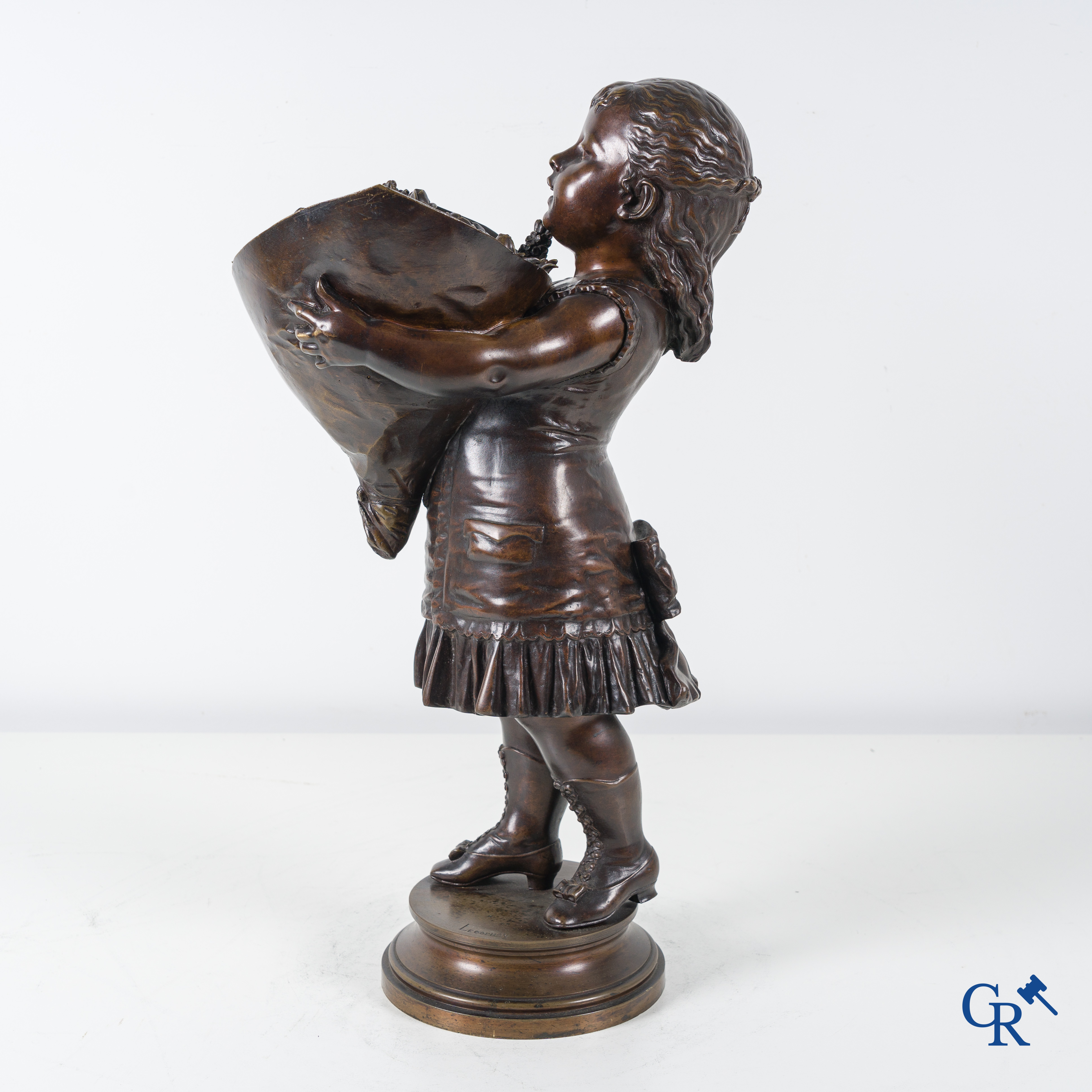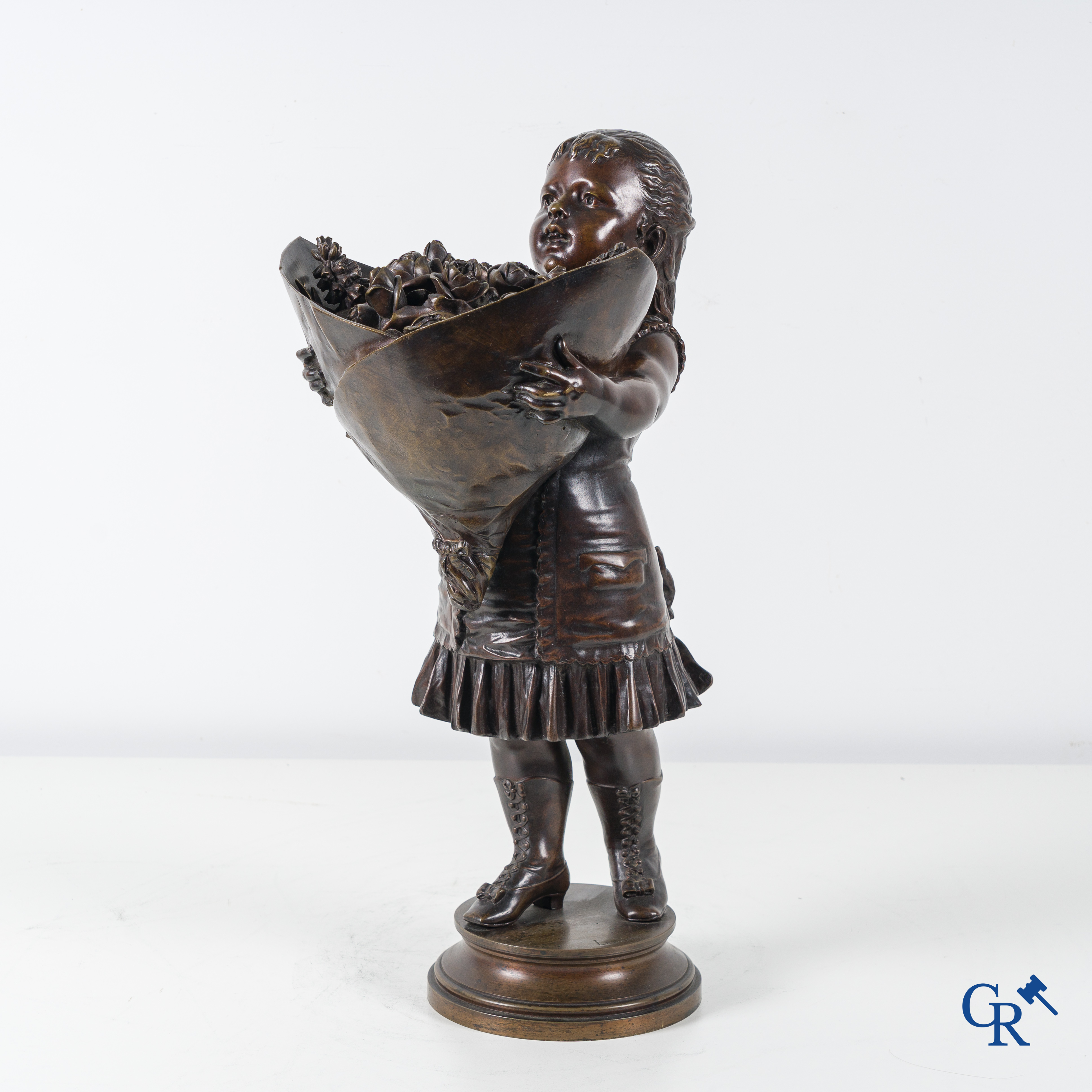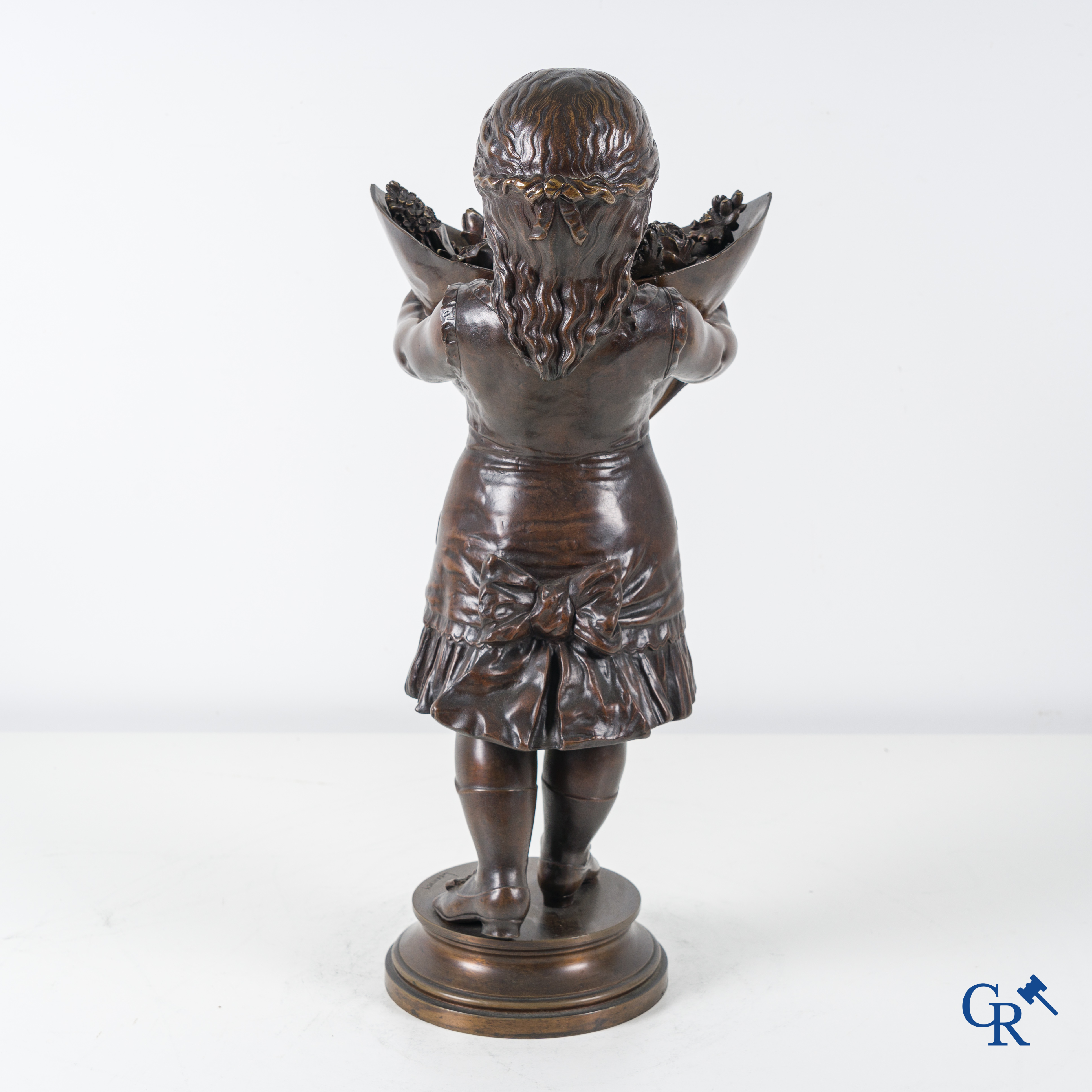 | Nicolas Lecorney, petite fille en bronze avec un bouquet de fleurs, XIXème siècle. |