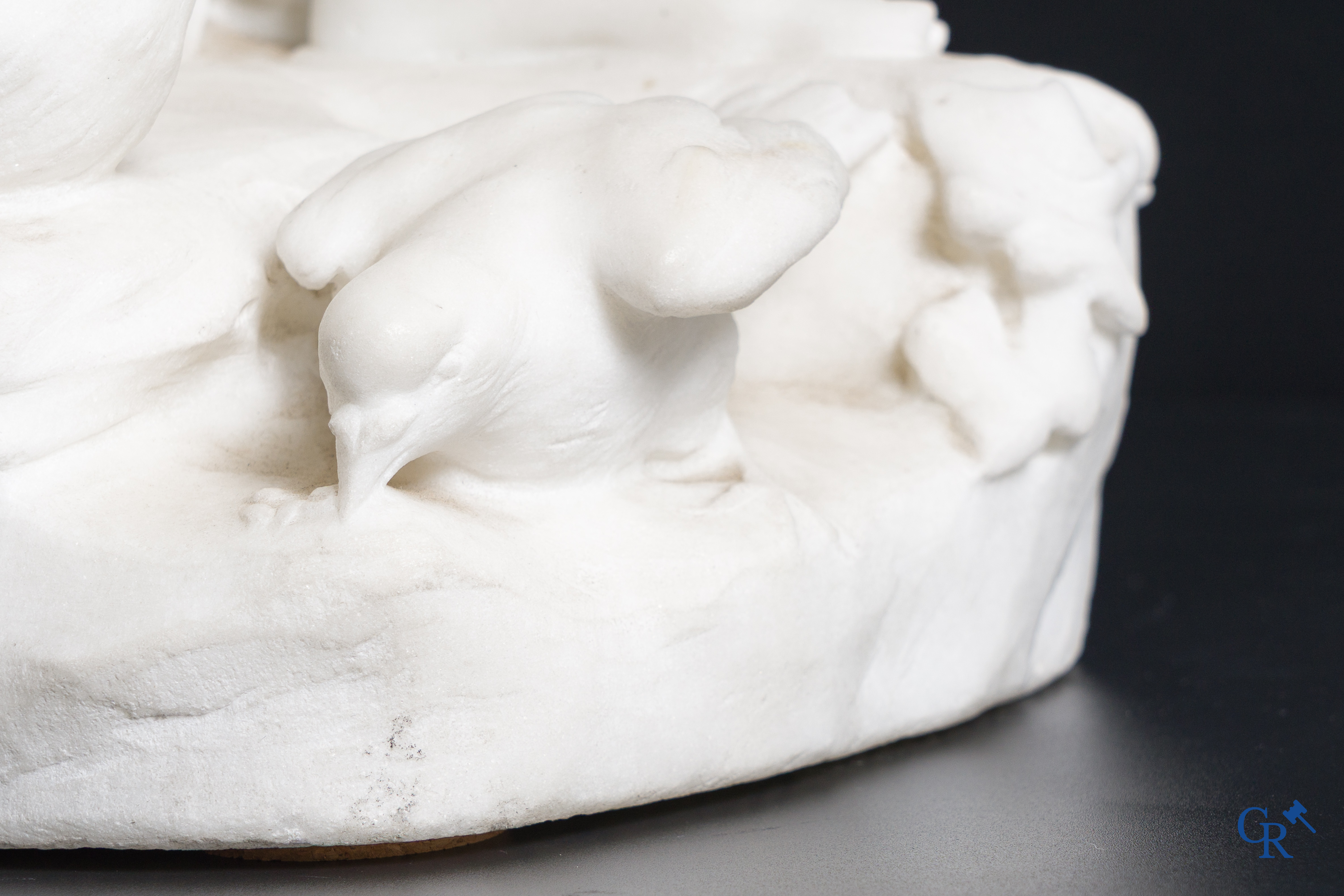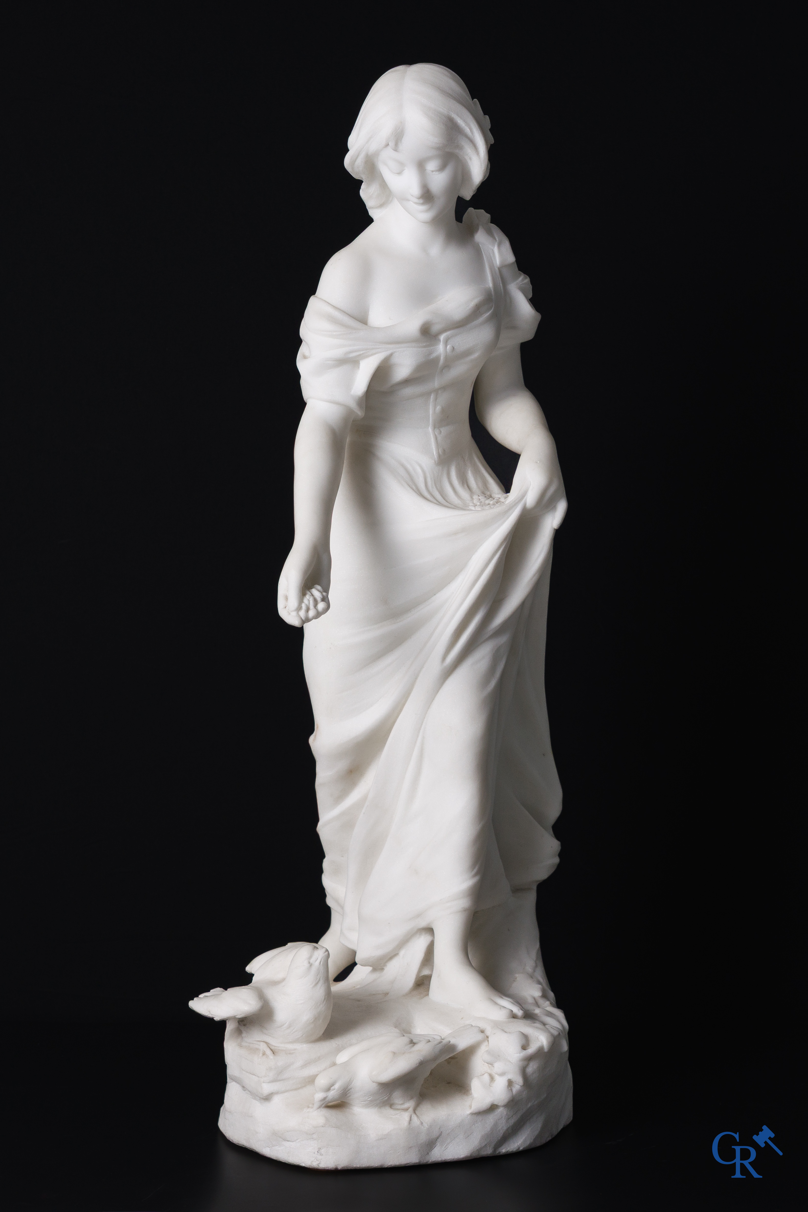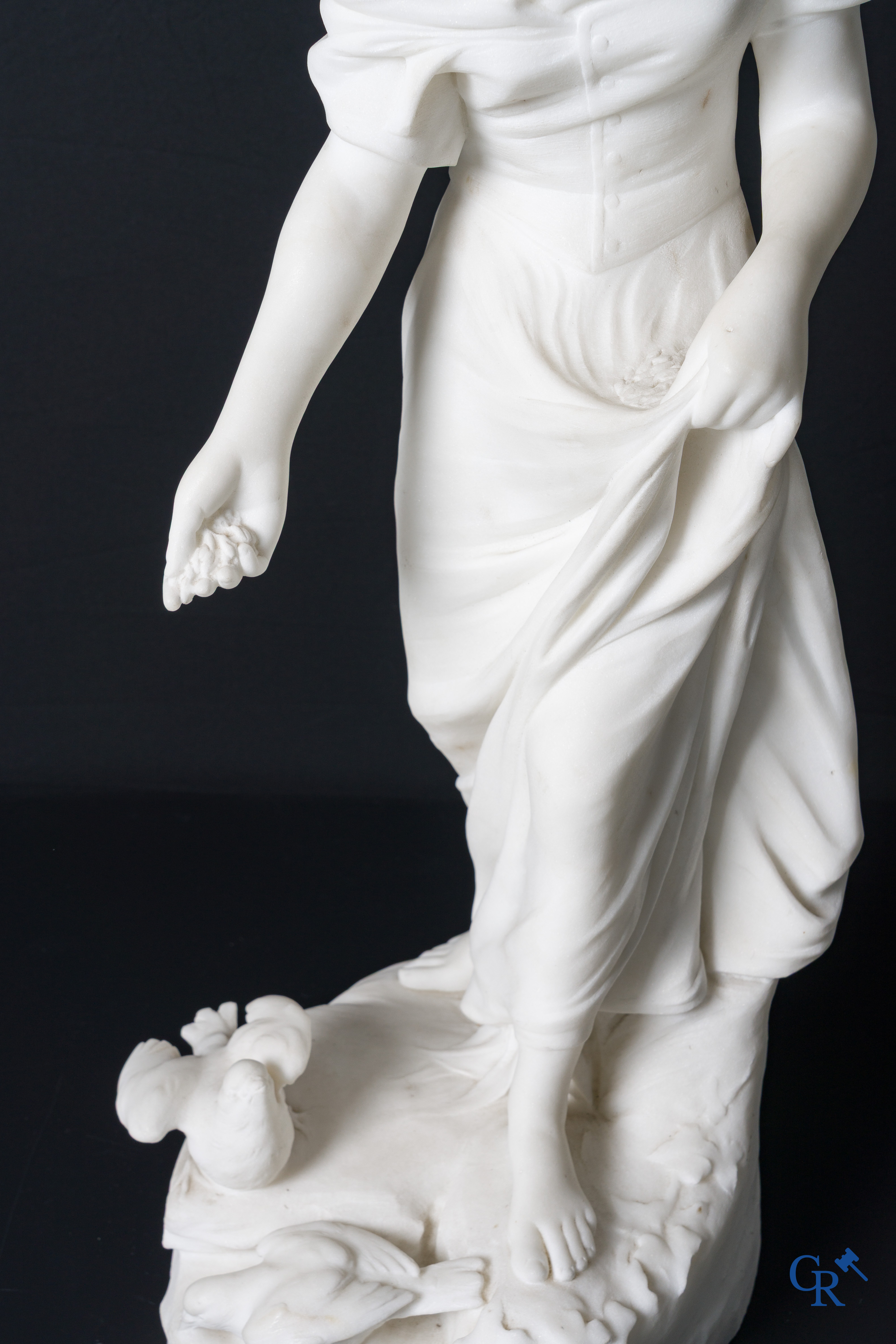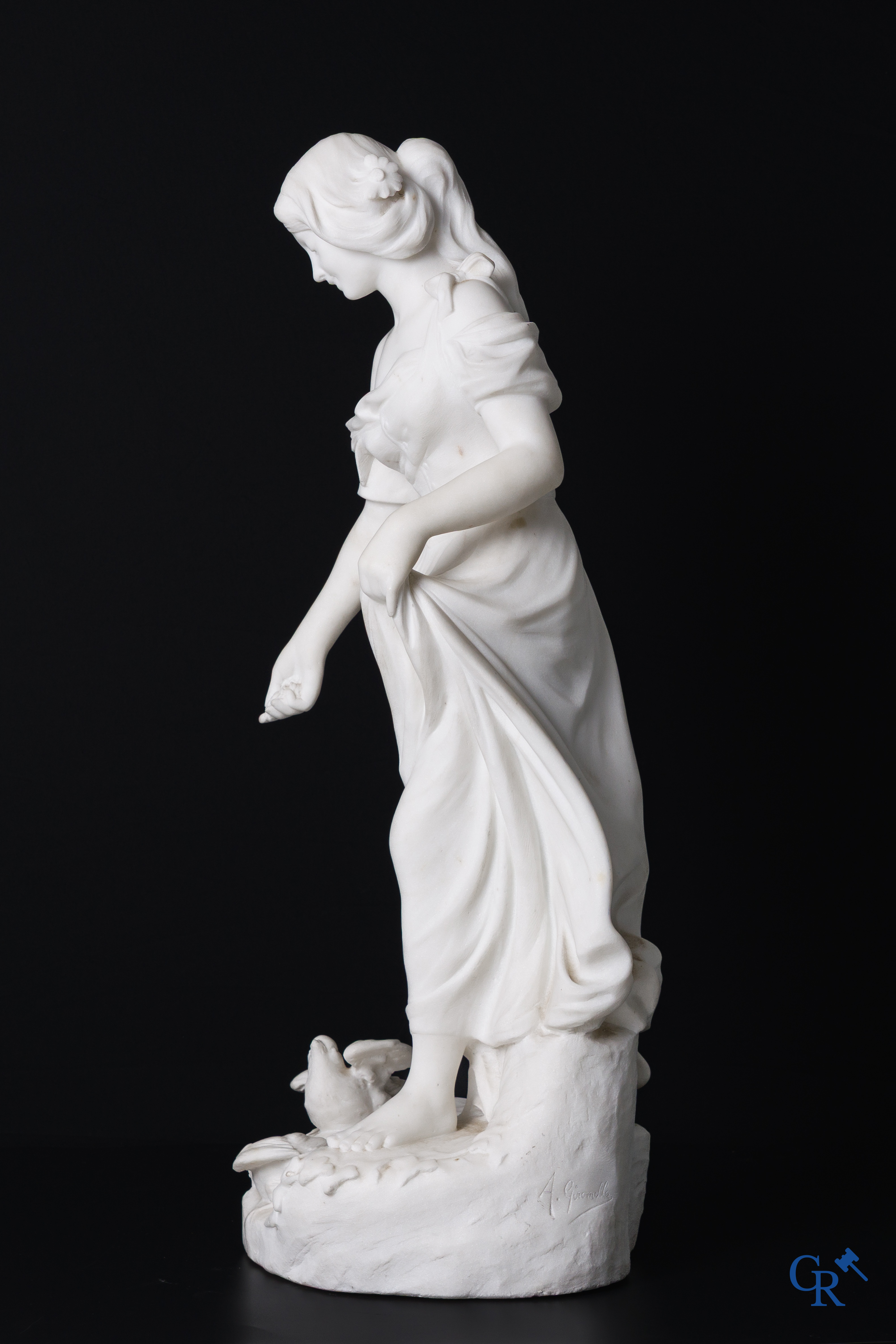 A. Giromelle, une sculpture en marbre de Carrare d'une jeune femme avec des oiseaux, vers 1910.