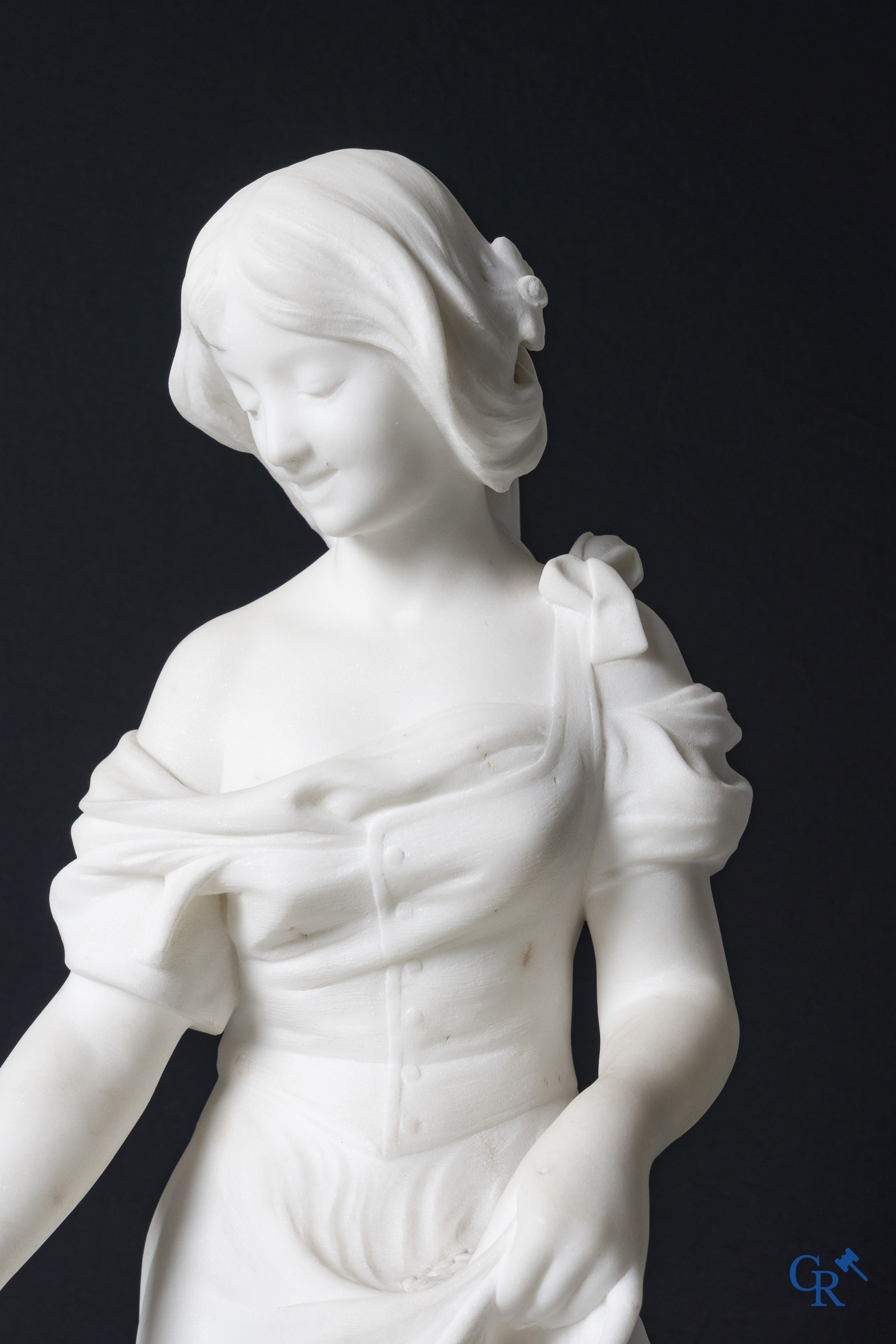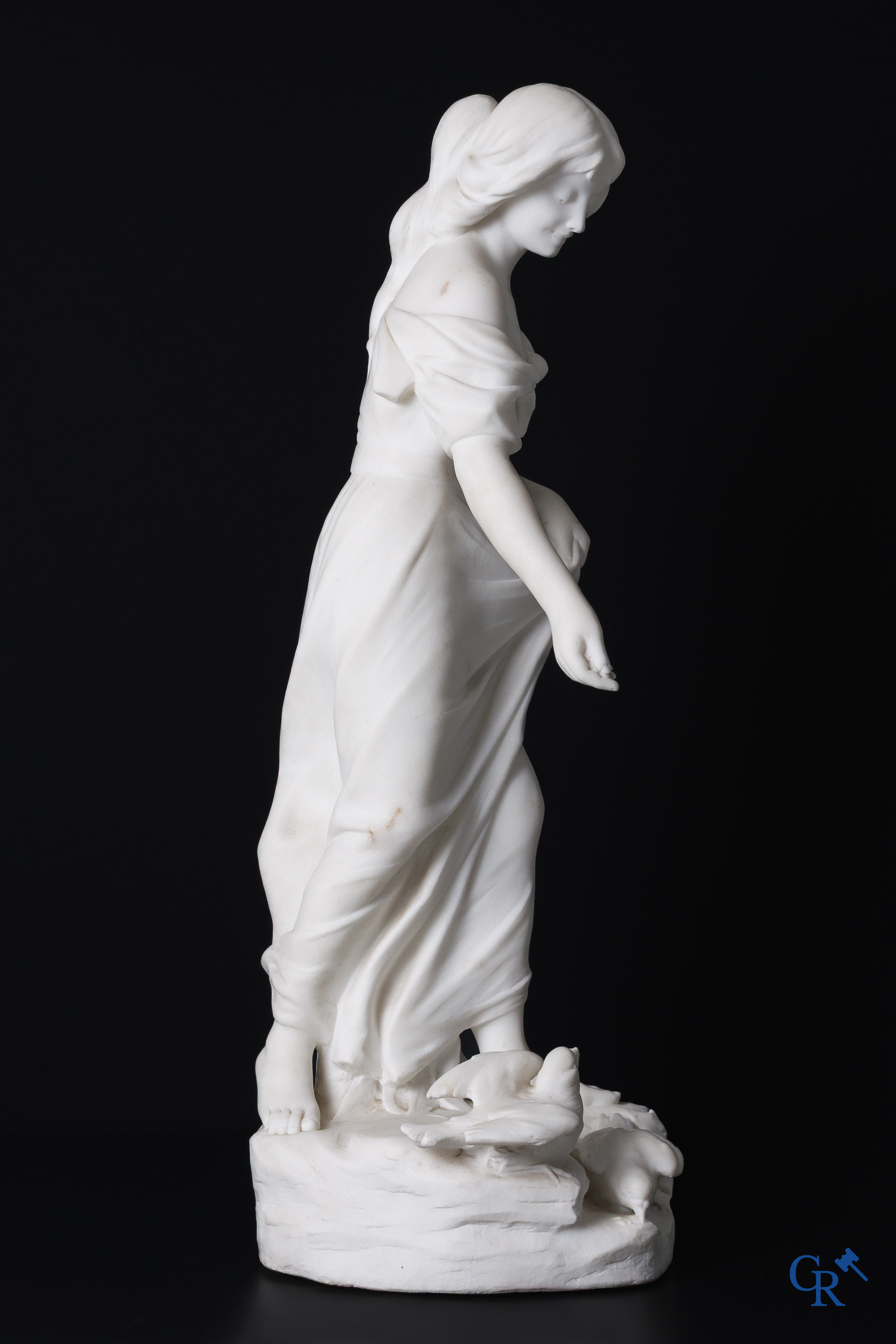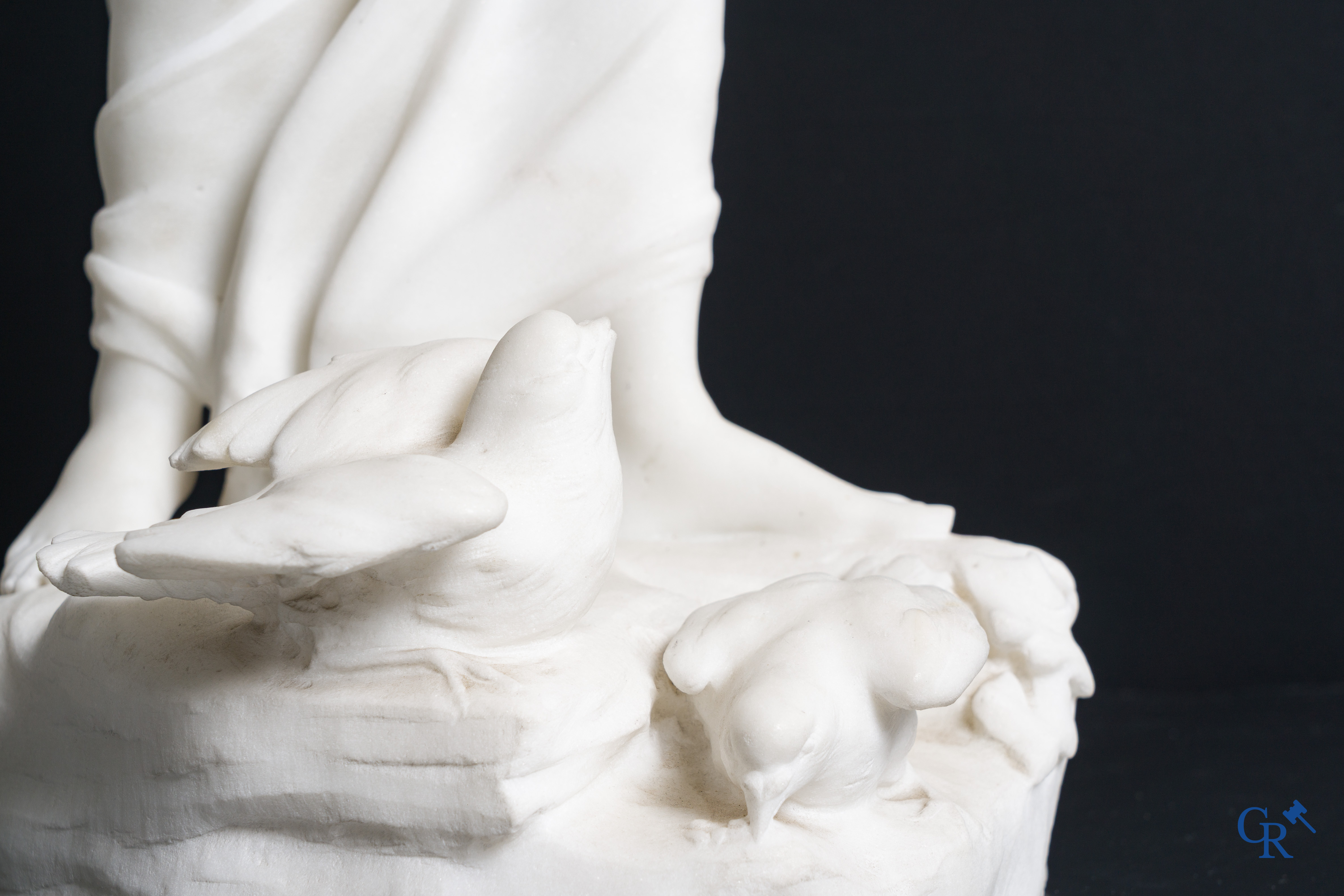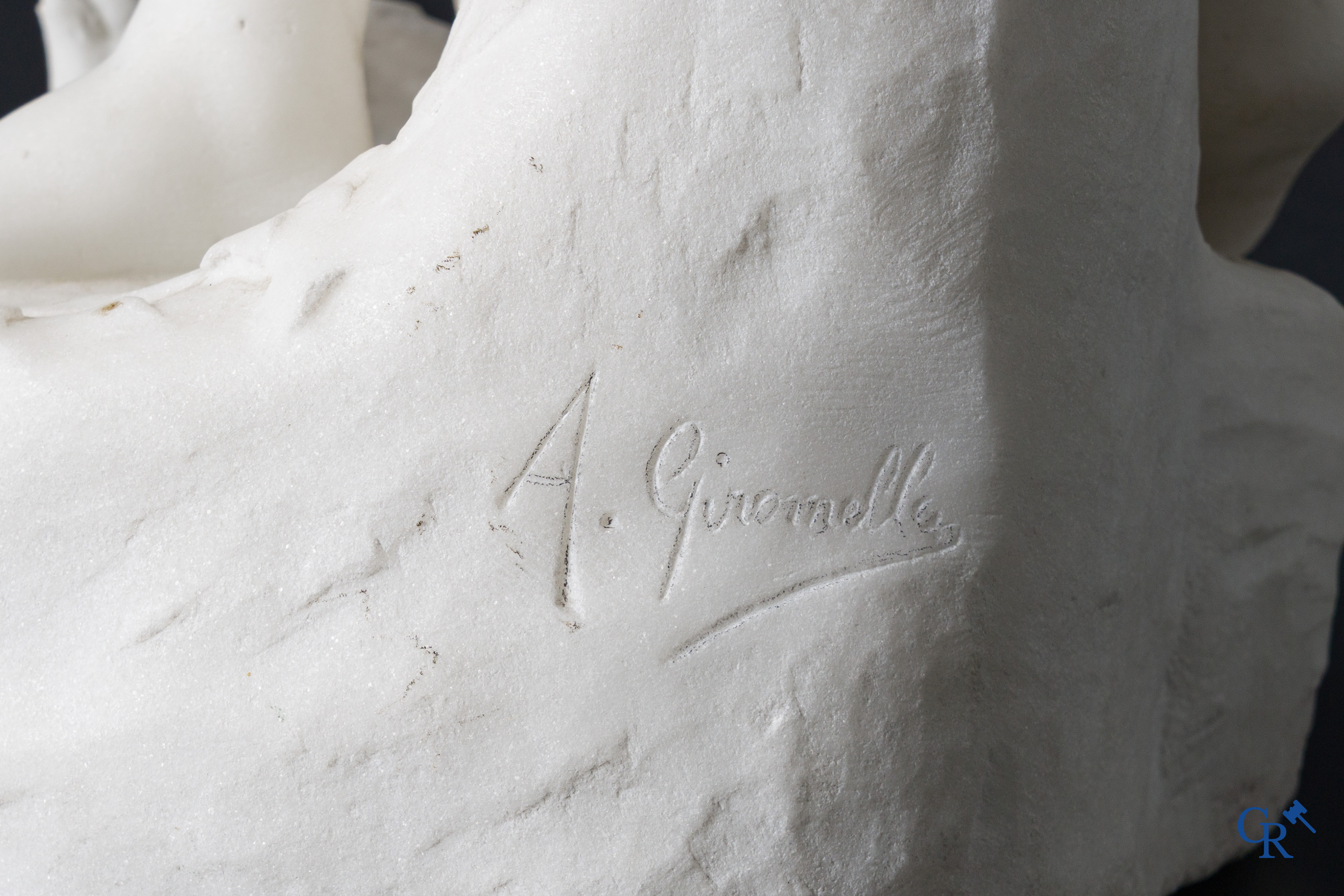 A. Giromelle, une sculpture en marbre de Carrare d'une jeune femme avec des oiseaux, vers 1910.