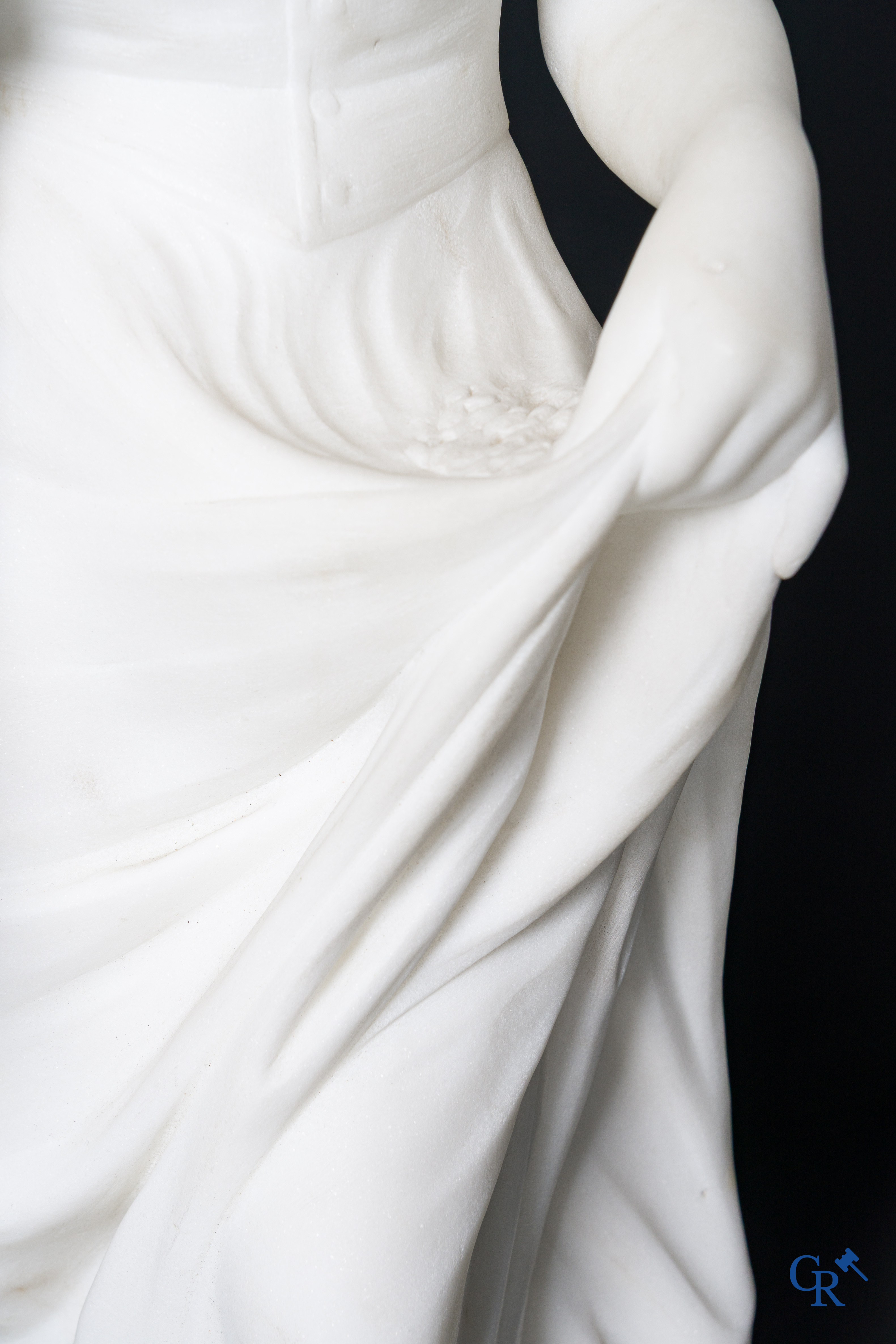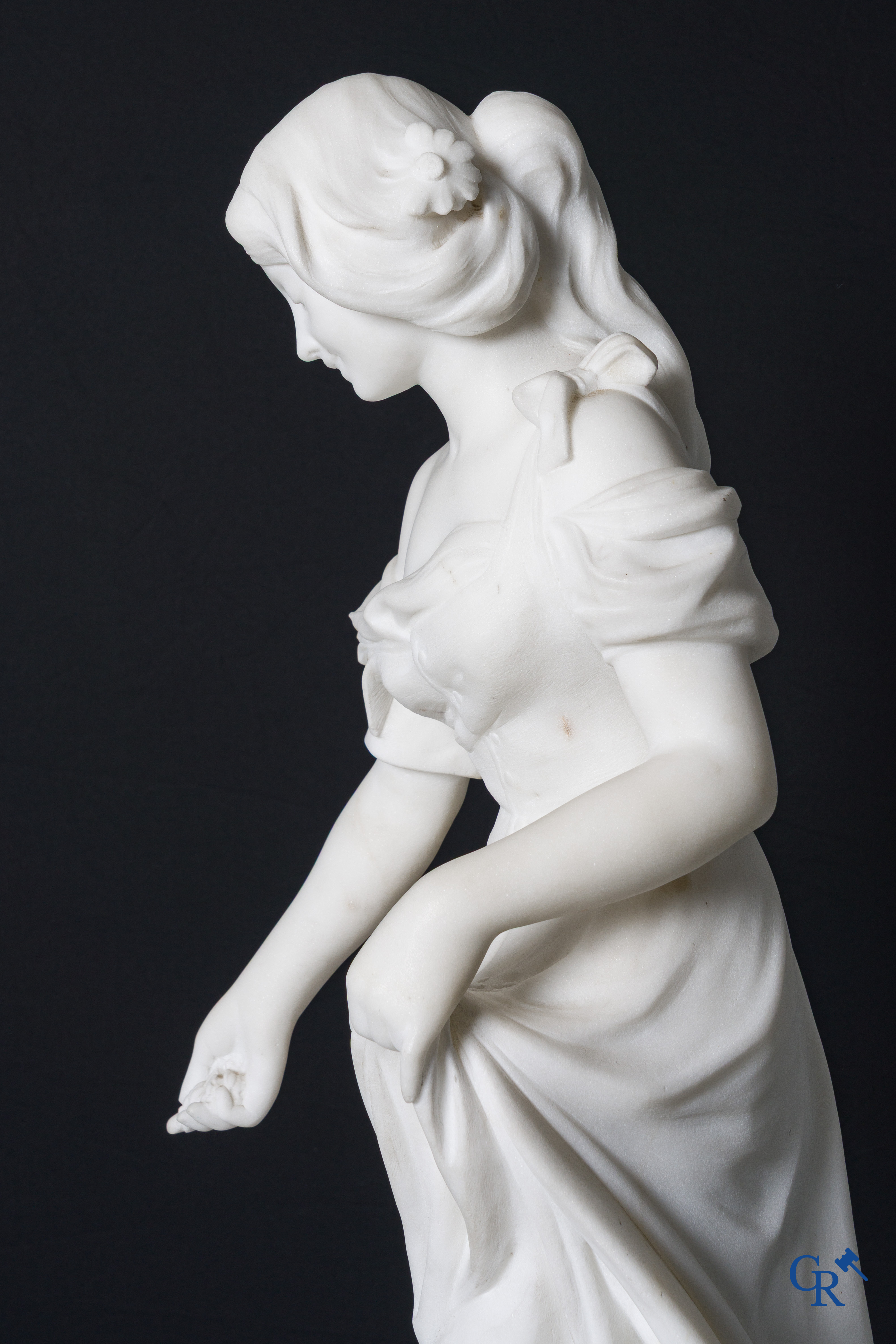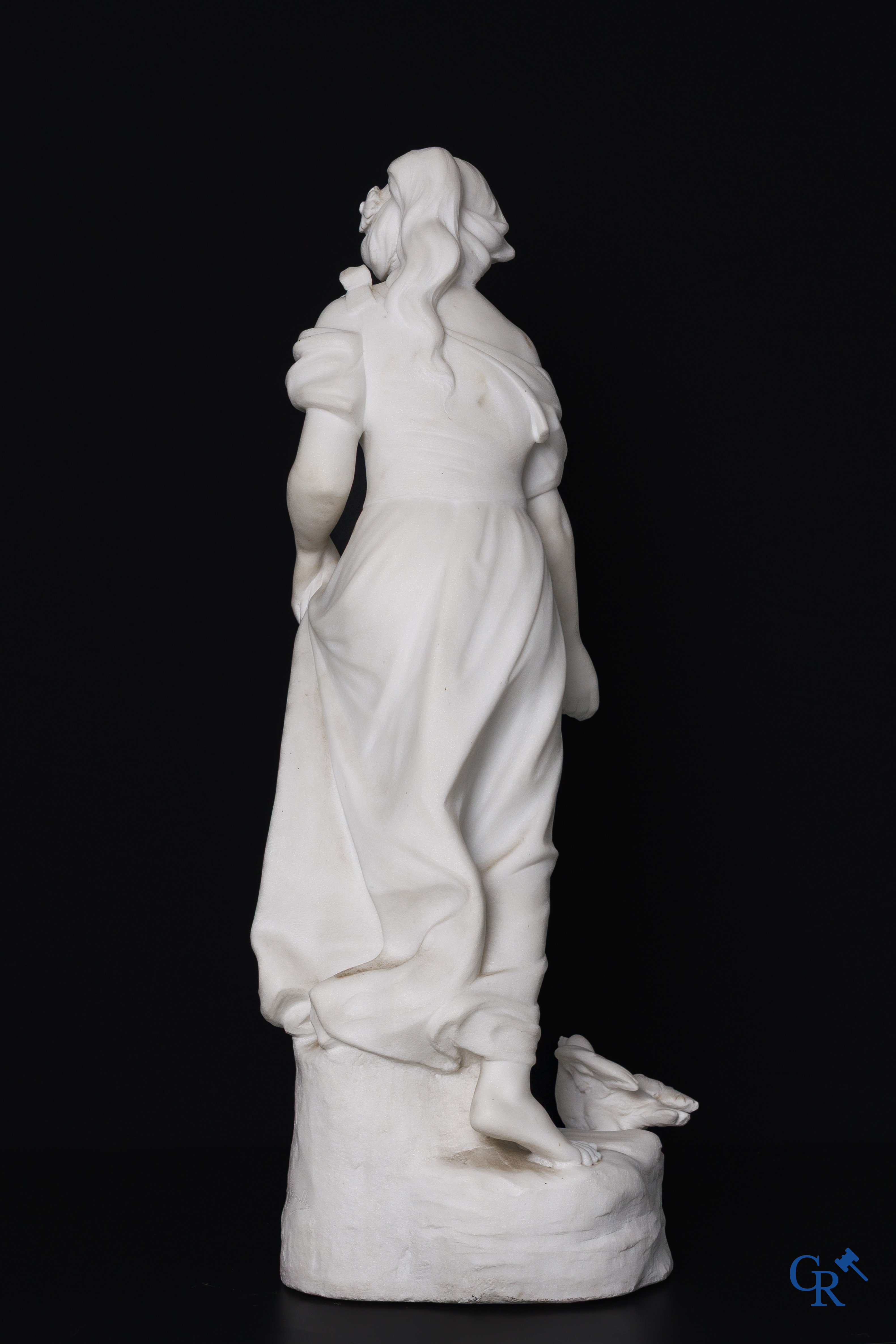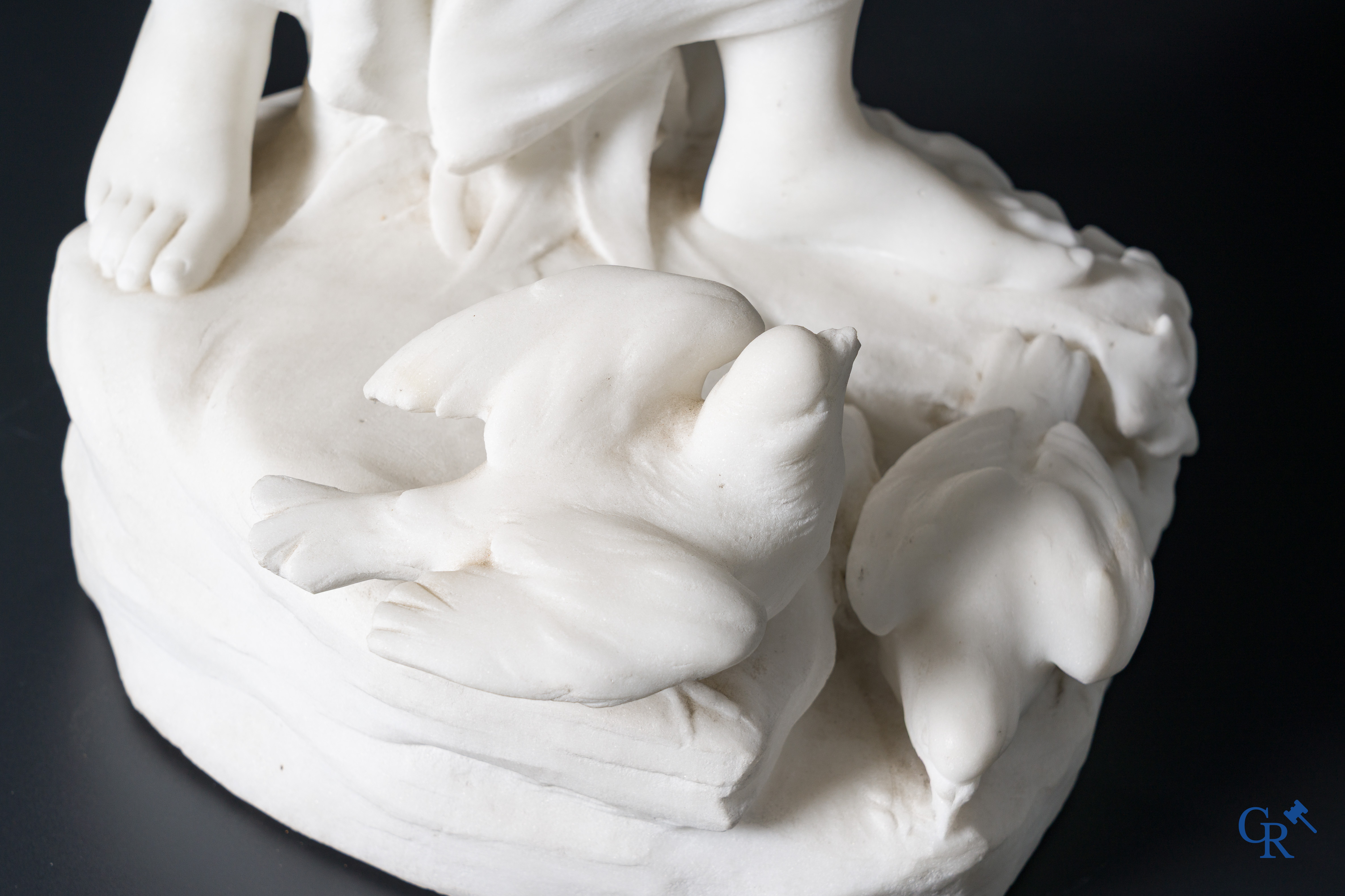A. Giromelle, une sculpture en marbre de Carrare d'une jeune femme avec des oiseaux, vers 1910.