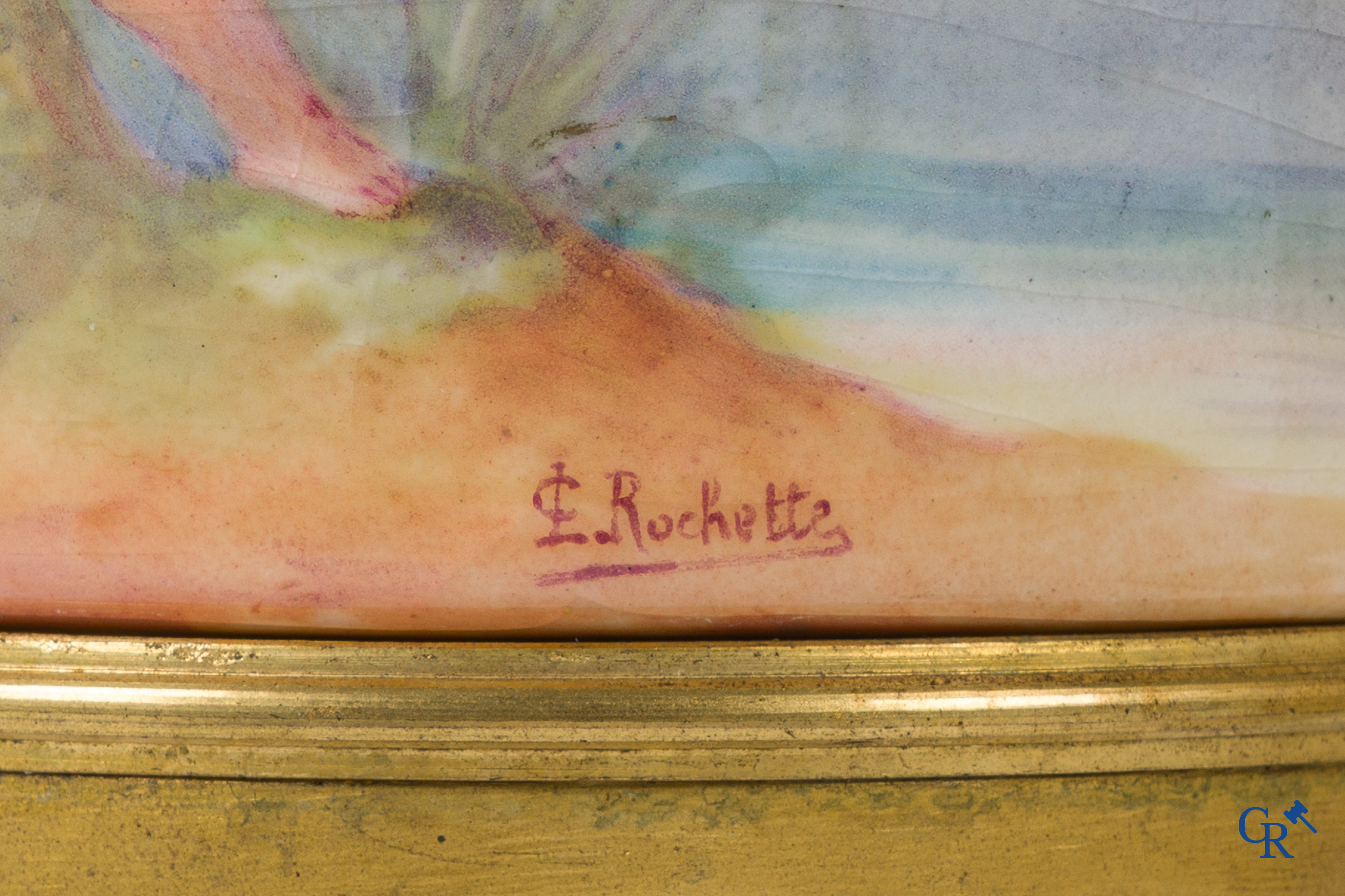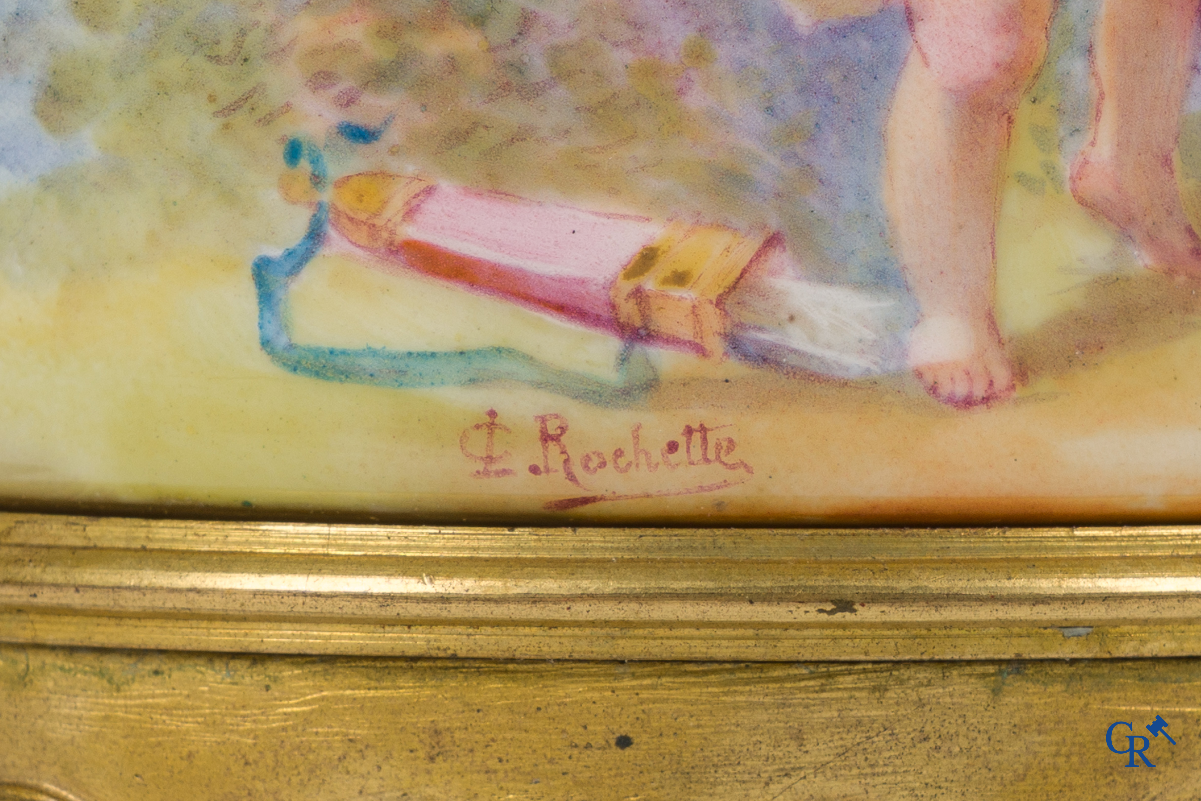 | Porcelaine: Sèvres: Paire de vases en porcelaine à décor multicolore et dorées en reliëf, montés en bronze. Style LXVI. Signé Rochette. Epoque Napoleon III. |