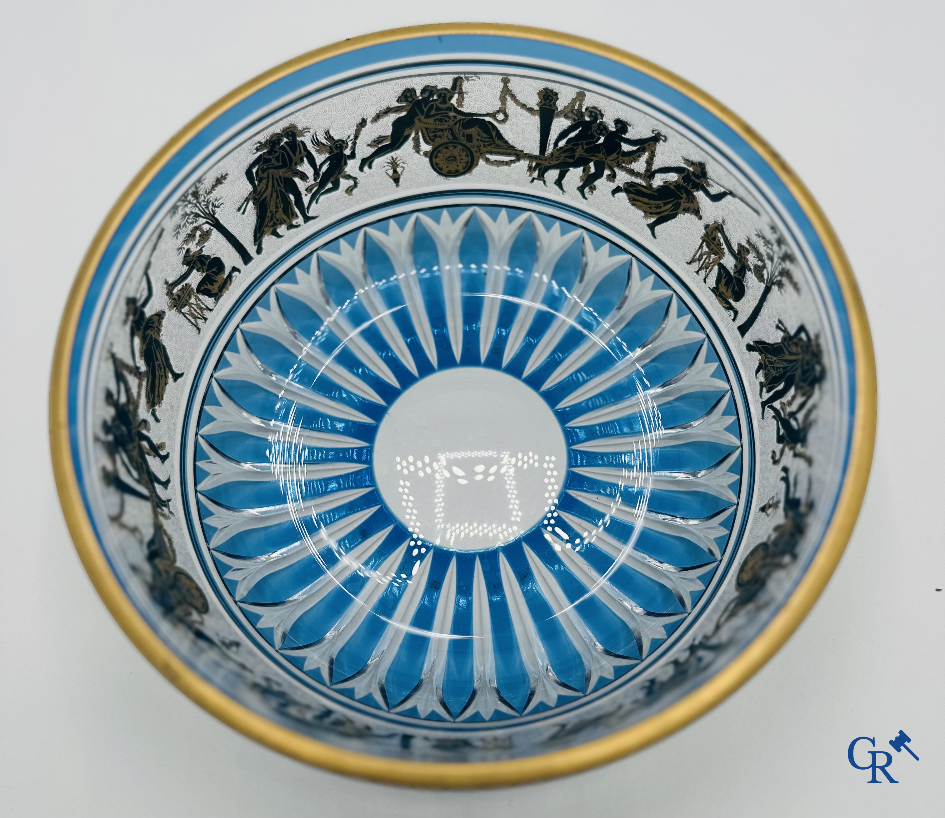| Val Saint Lambert: Léon Ledru. Coupe à fruit modèle "Florence" sur un fond bleu clair. Vers 1920. Excellent état. |
