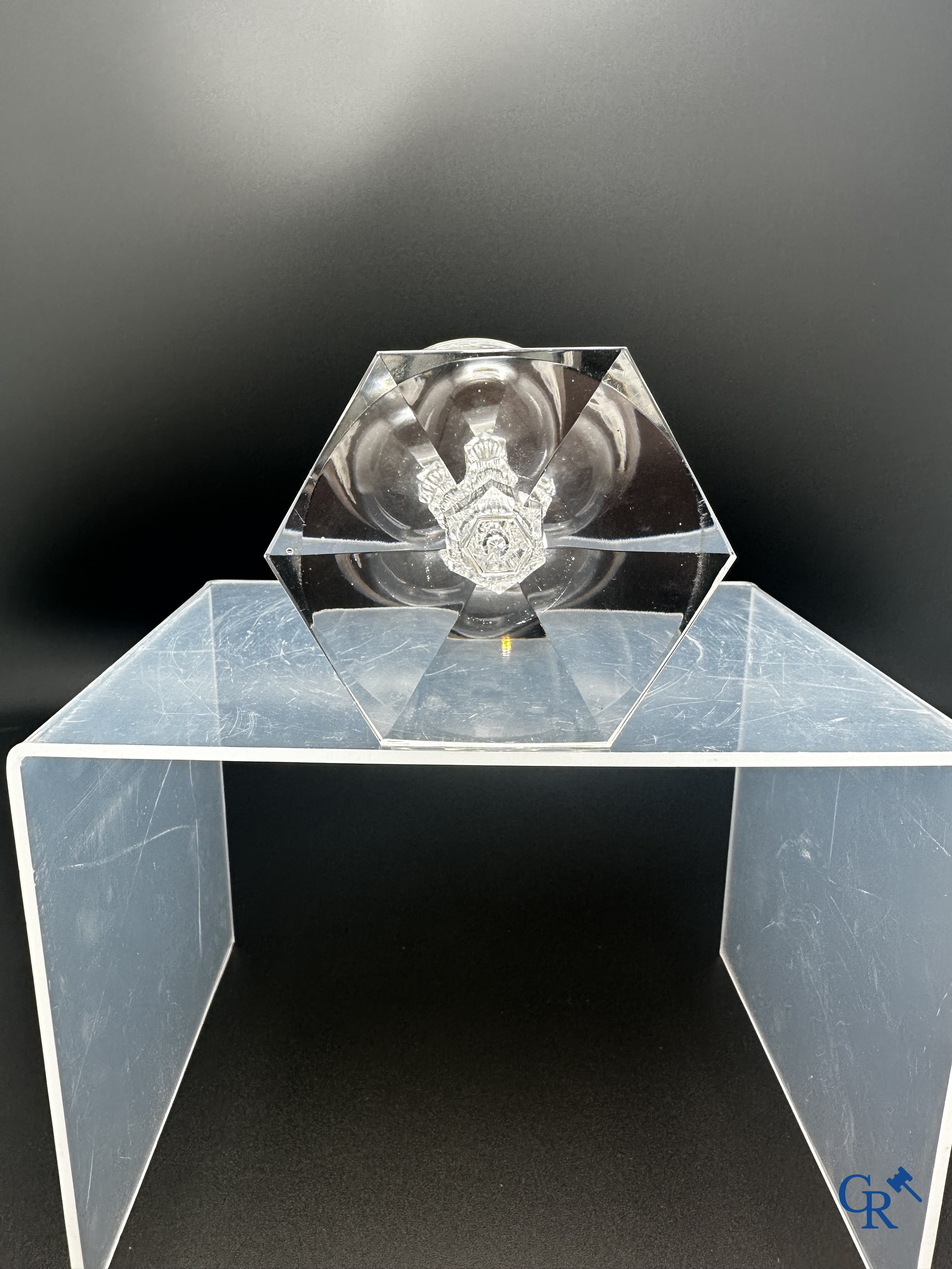 | Val Saint Lambert: Exceptionnel verre à vin en cristal blanc décoré de 2 armoiries couronnées tenues par des anges. XIXe siècle. |