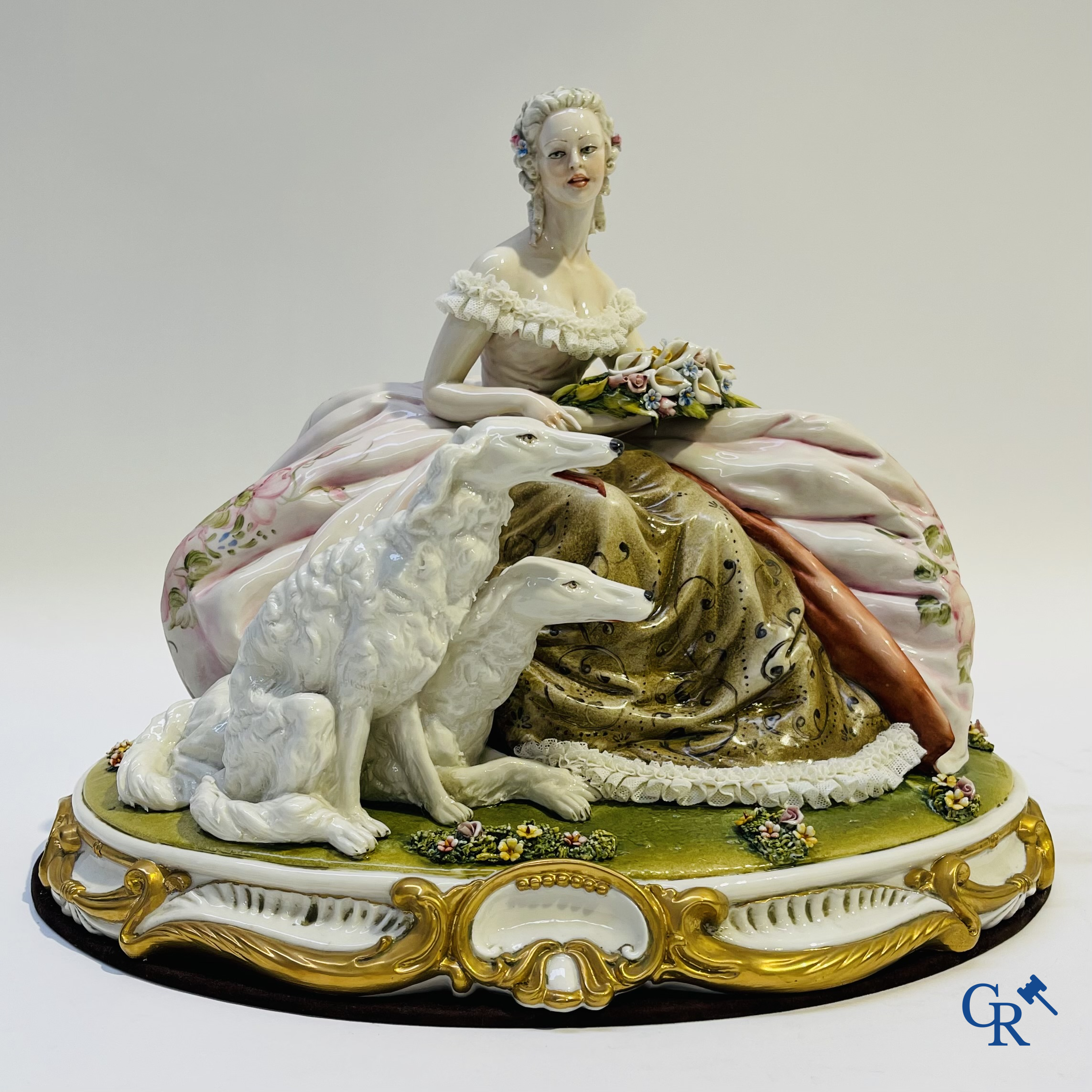 | Porcelaine: Capodimonte: Luciano Cazzalo. Groupe exceptionnel en porcelaine italienne avec dentelle. lace porcelain. Dame avec 2 Barzois (lévriers russes) Signé L. Cazzalo. Marqué: Capodimonte porcellane Principe. |