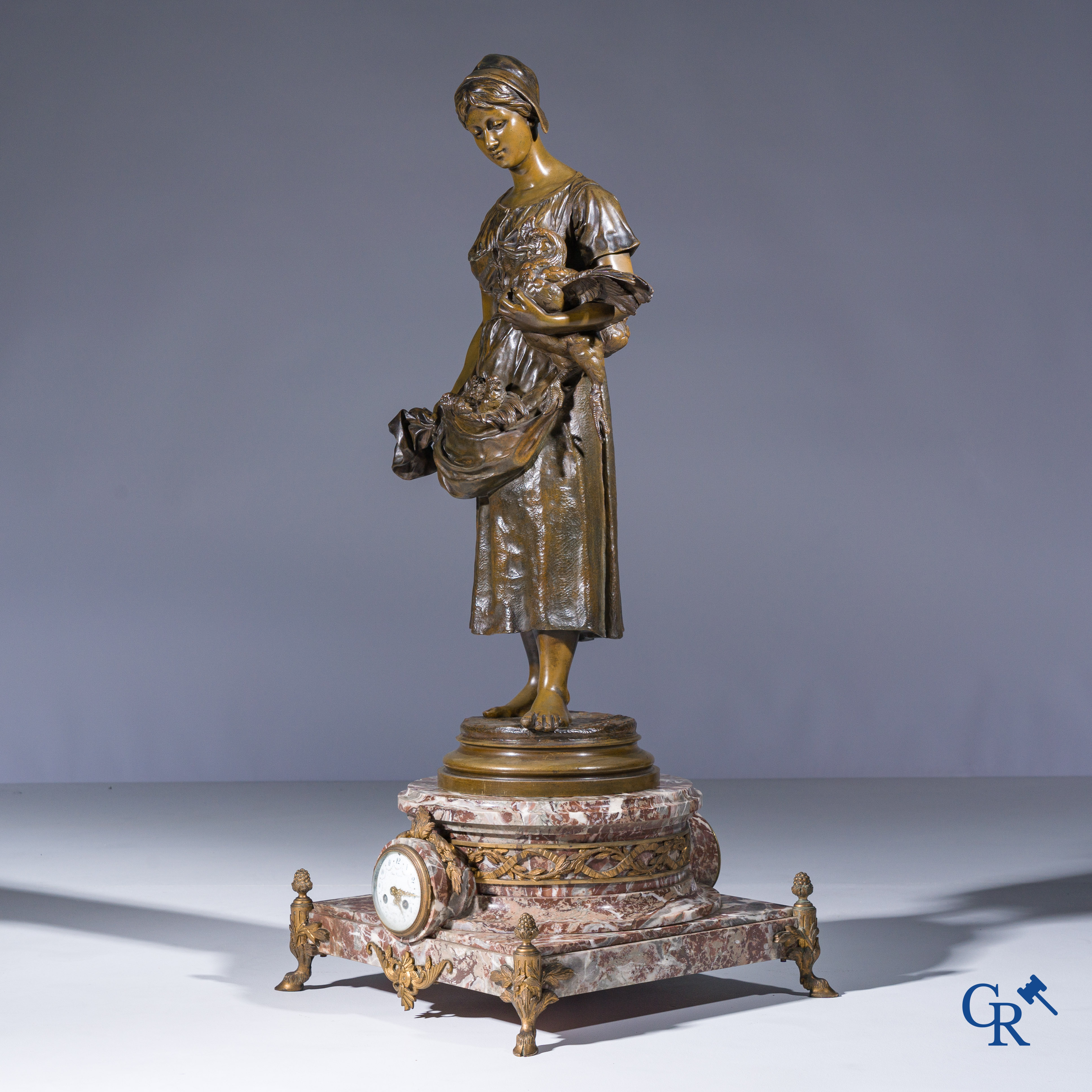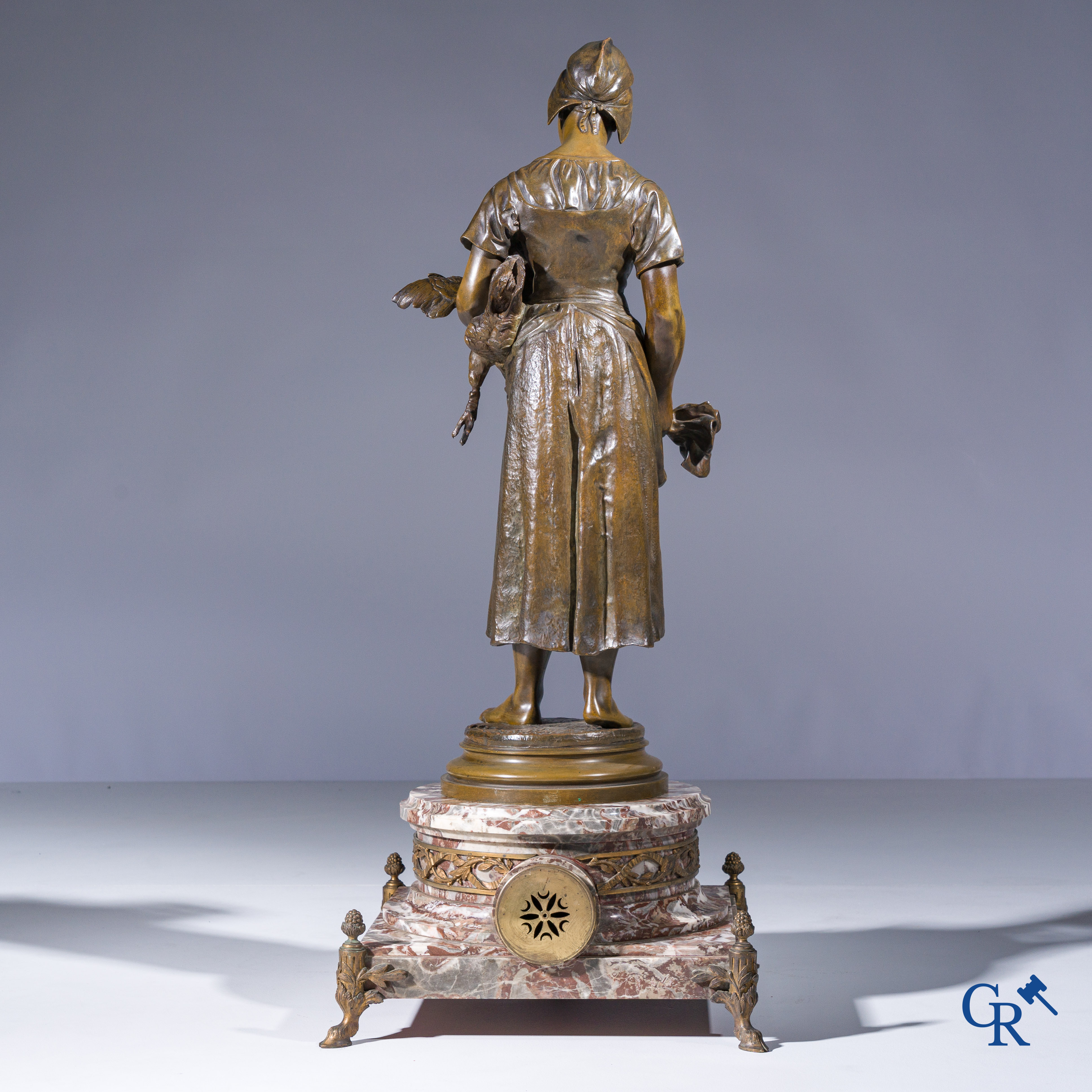 Alfred Barye (1839-1882) Schouwklok in marmer en brons. De kippenhoedster. Gesigneerd. 19e eeuw.