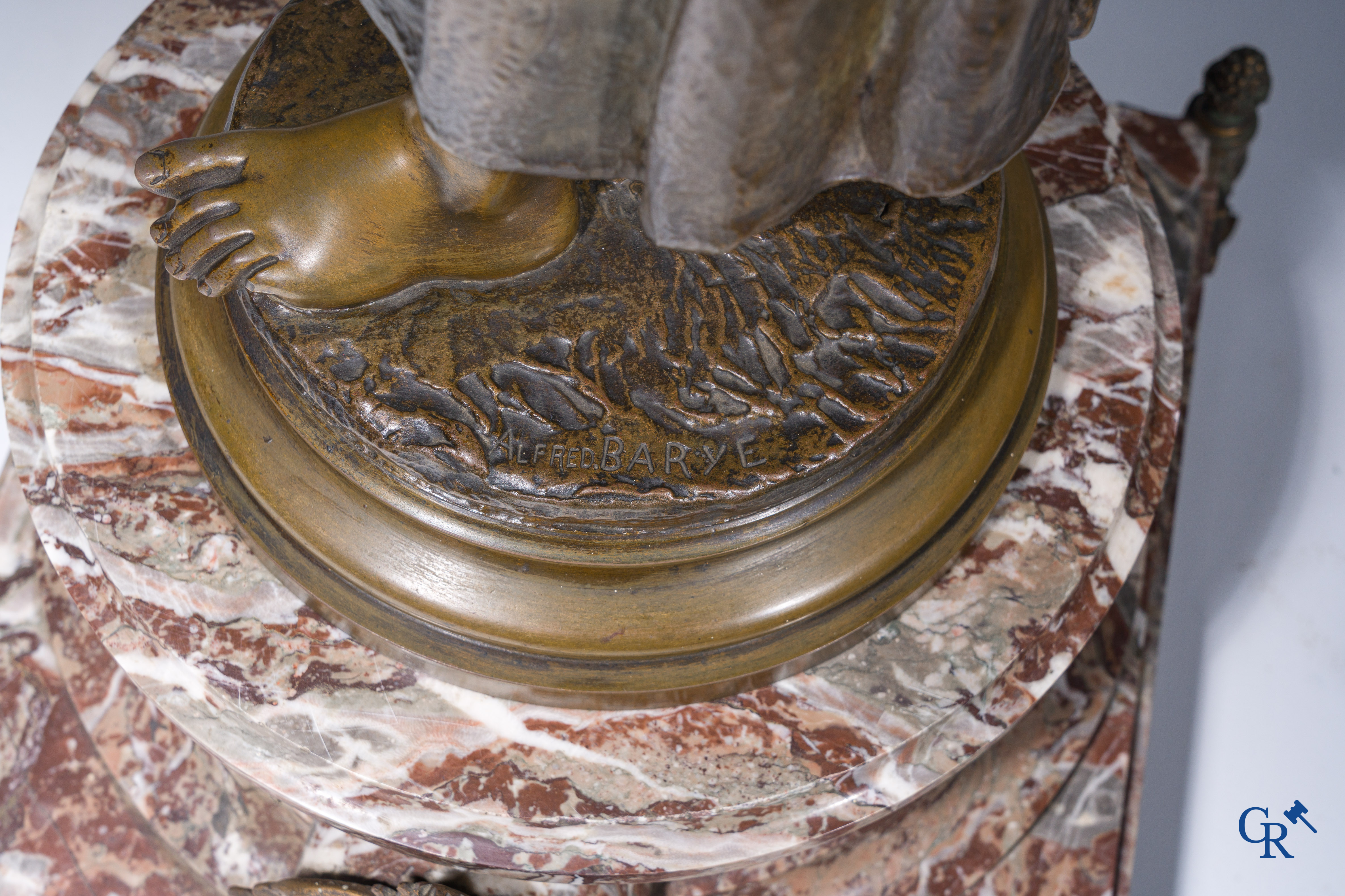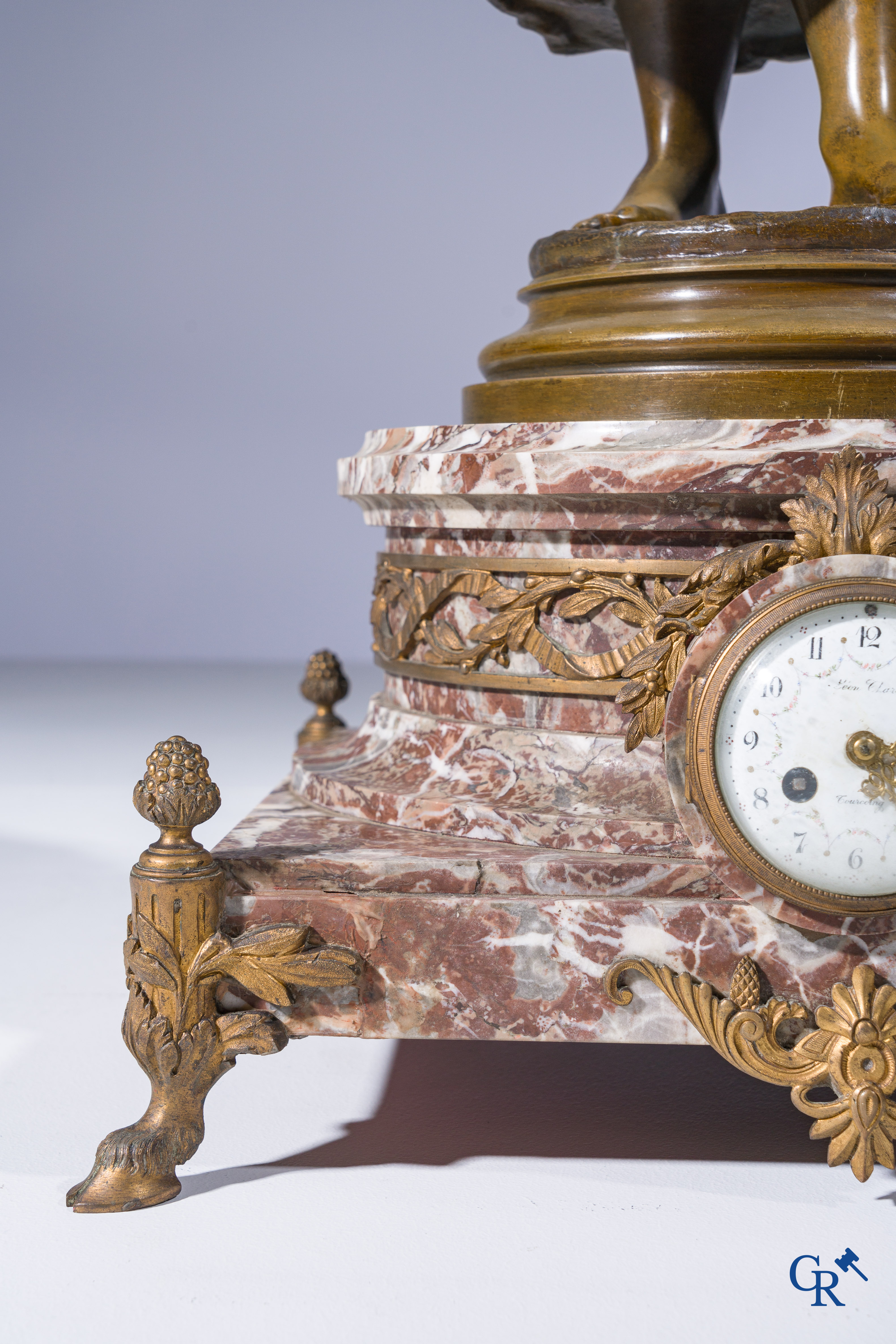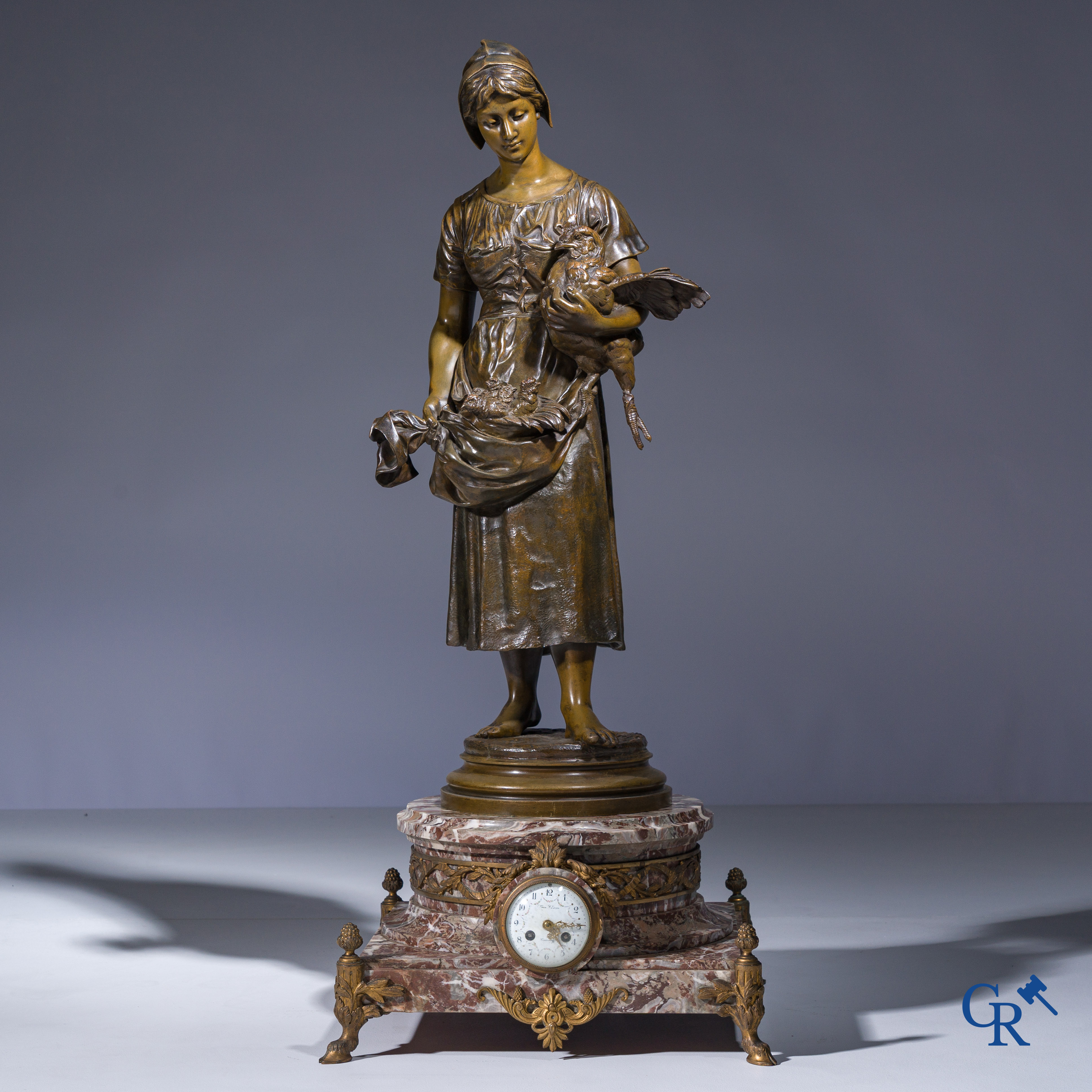 | Alfred Barye (1839-1882) Schouwklok in marmer en brons. De kippenhoedster. Gesigneerd. 19e eeuw. |