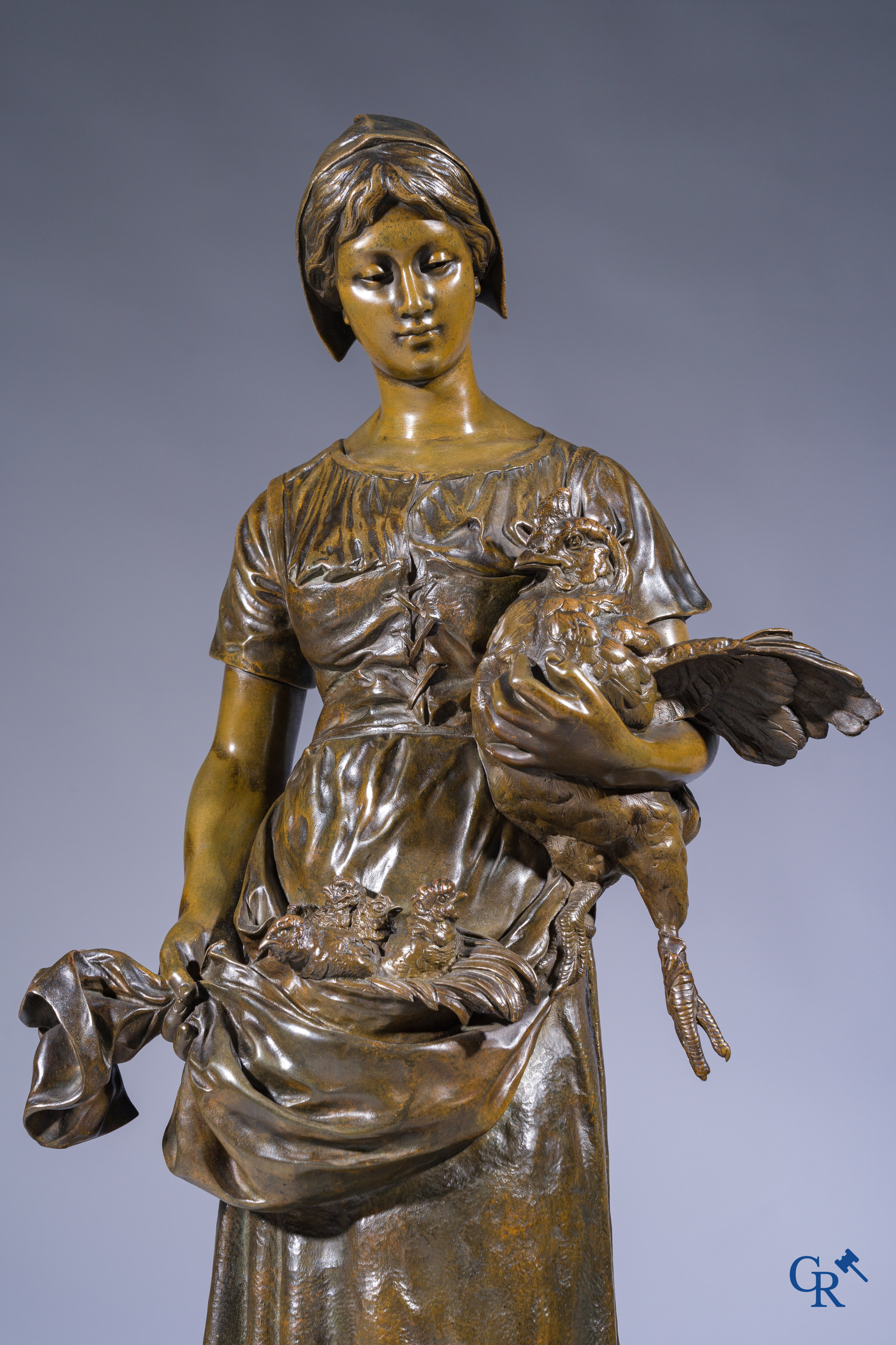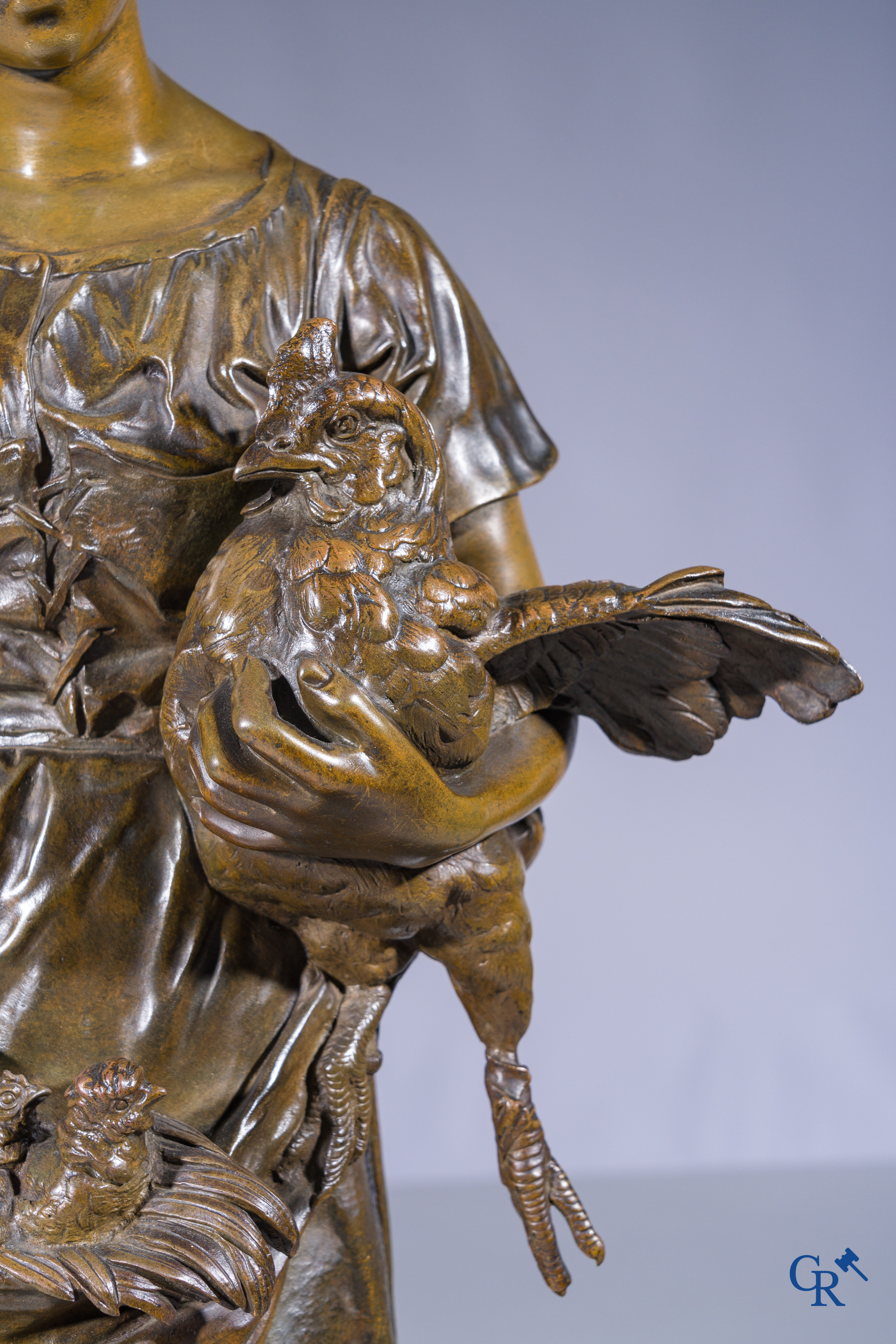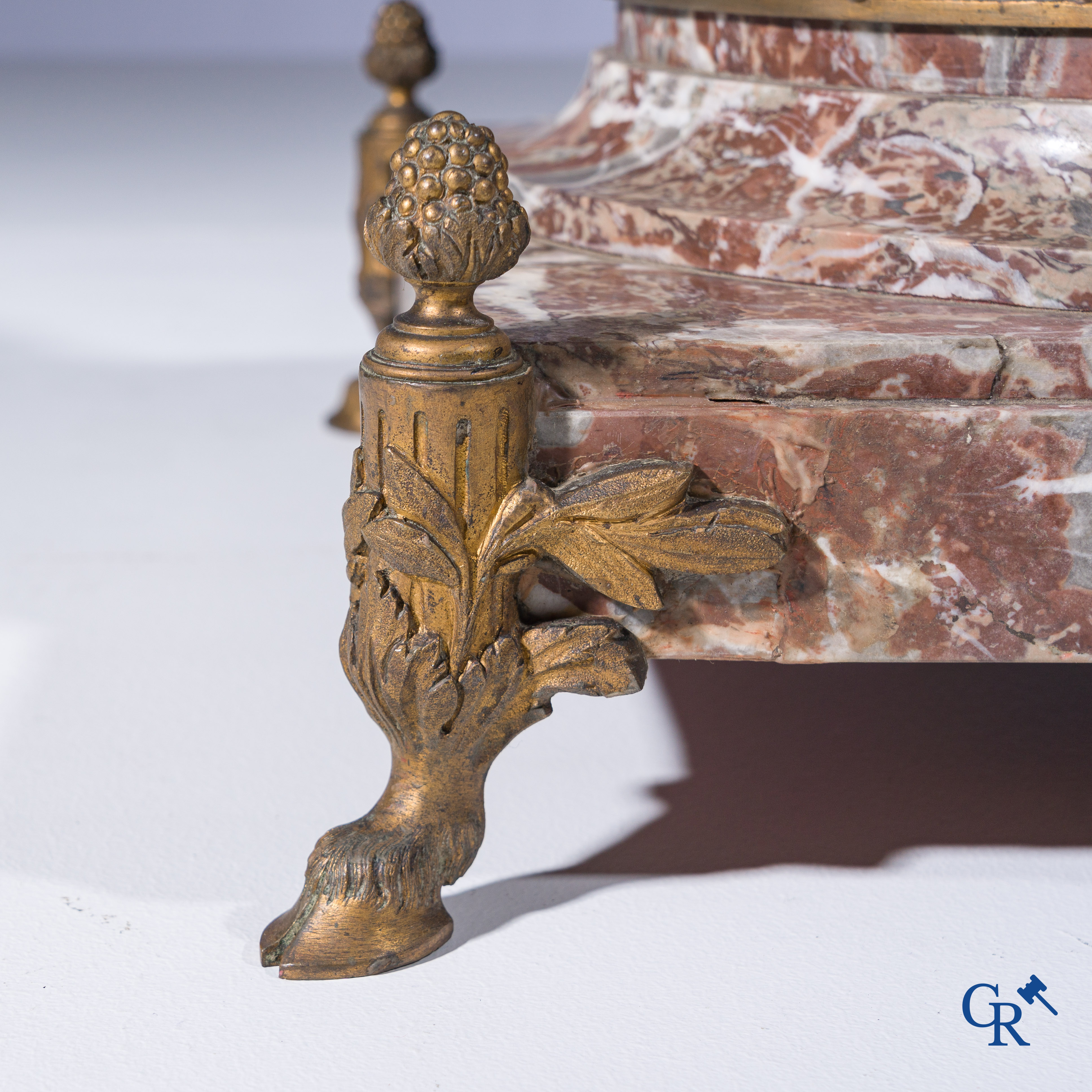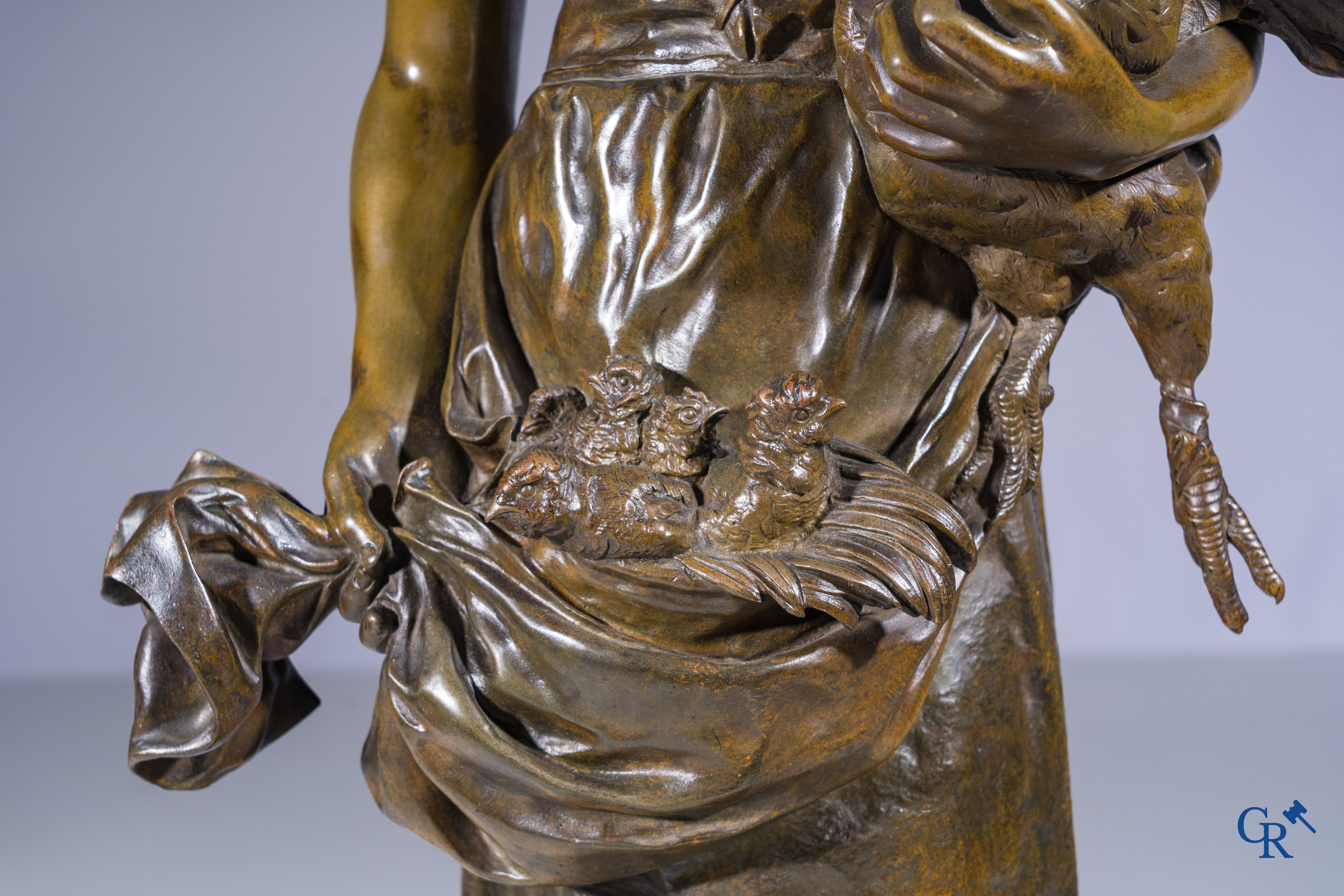 | Alfred Barye (1839-1882) Schouwklok in marmer en brons. De kippenhoedster. Gesigneerd. 19e eeuw. |