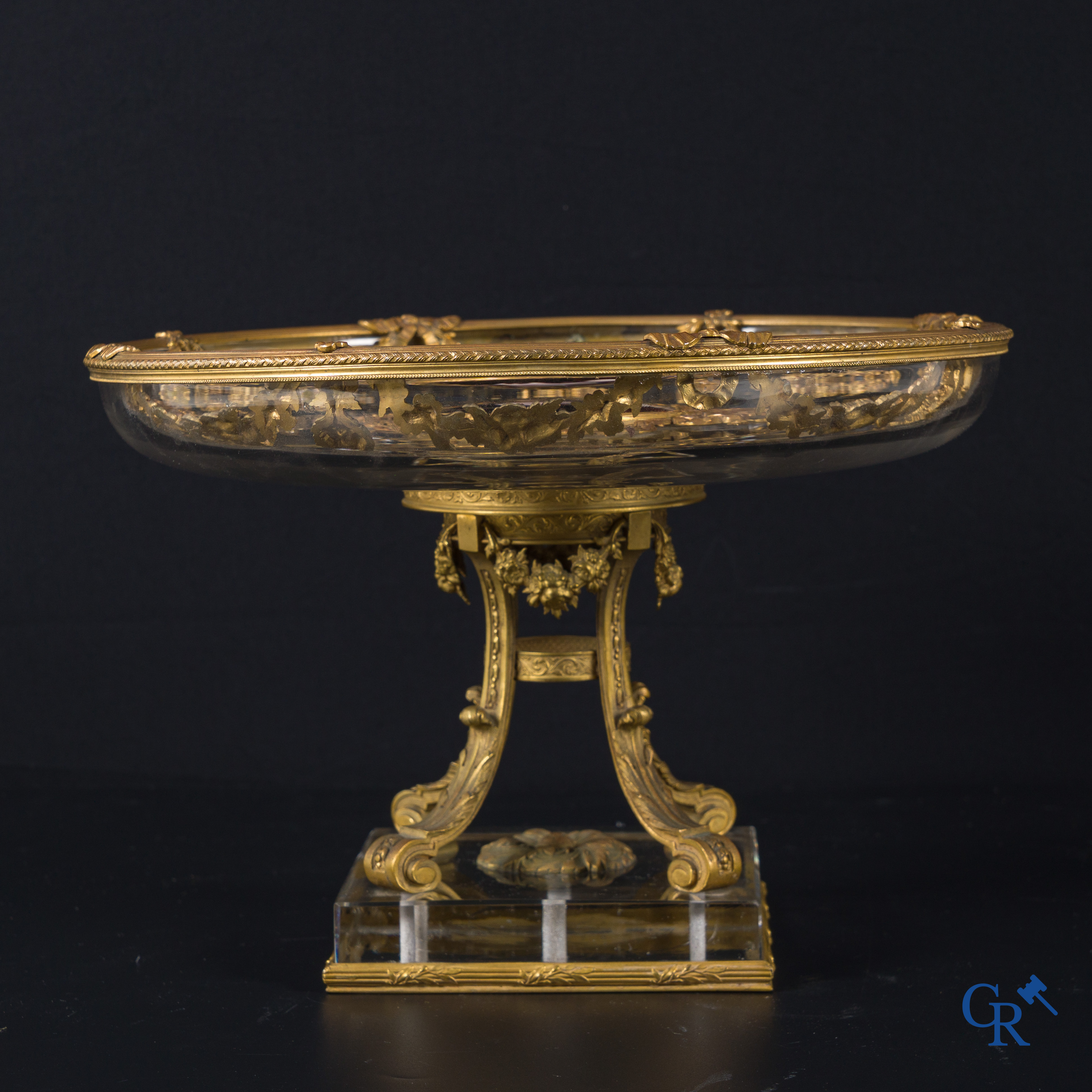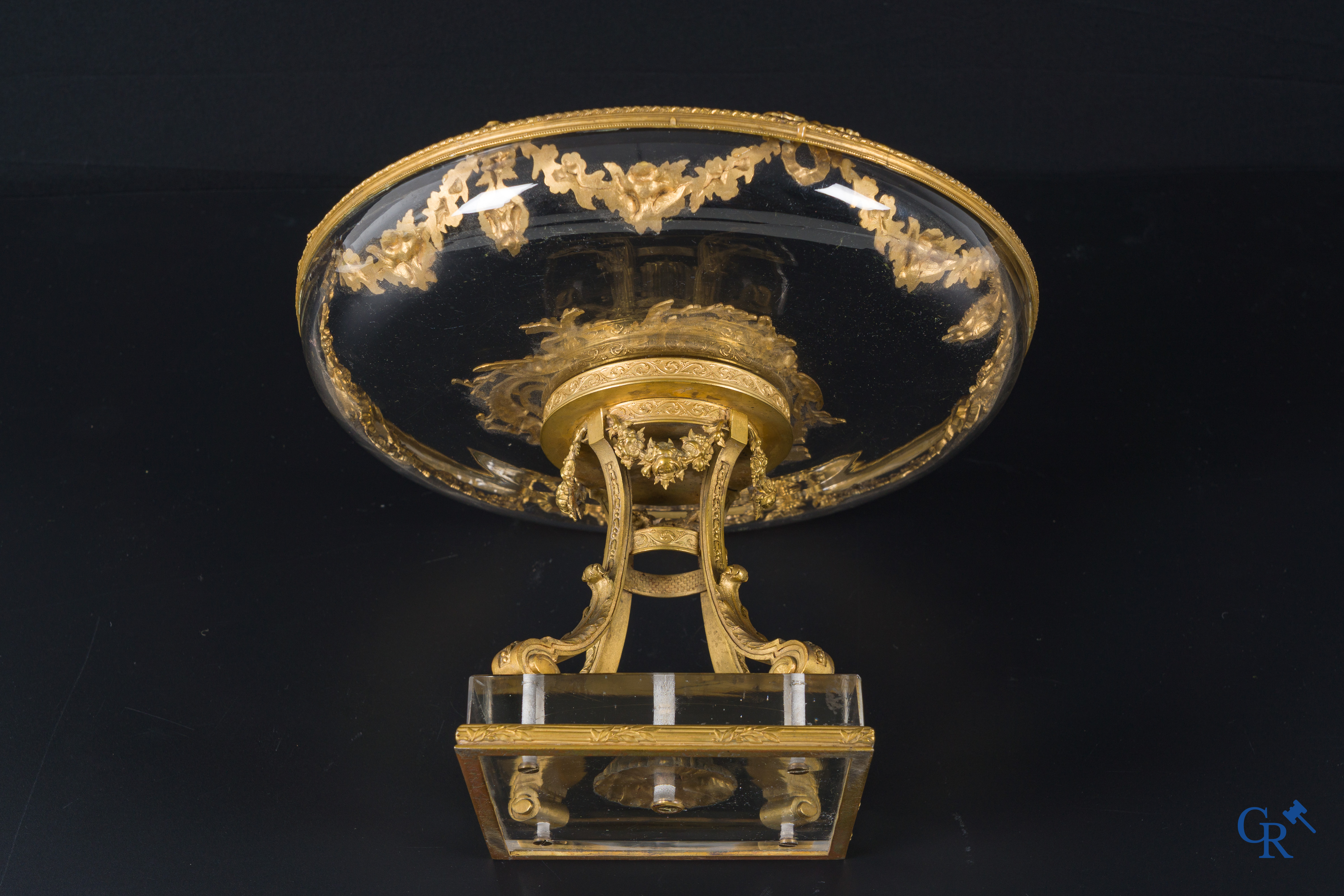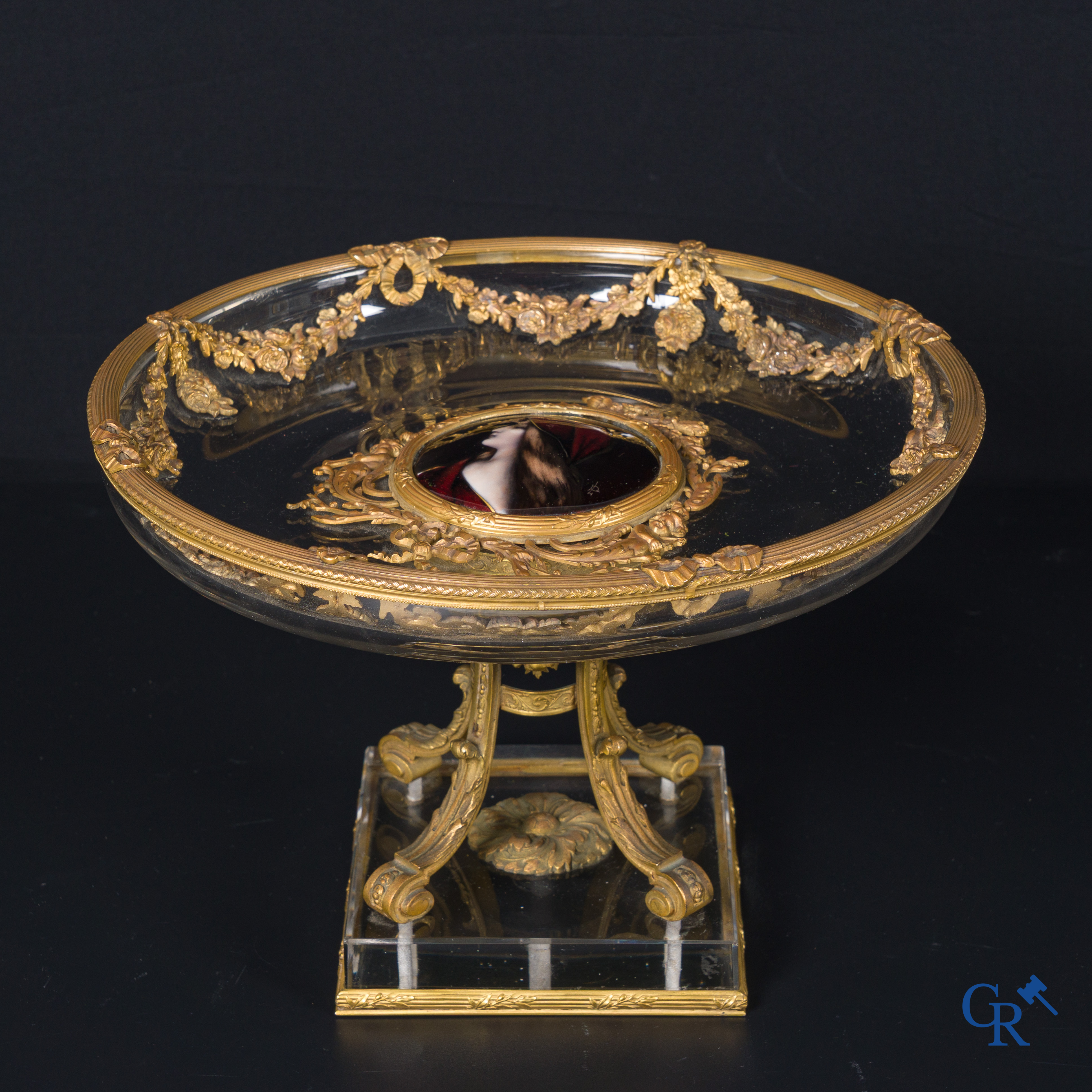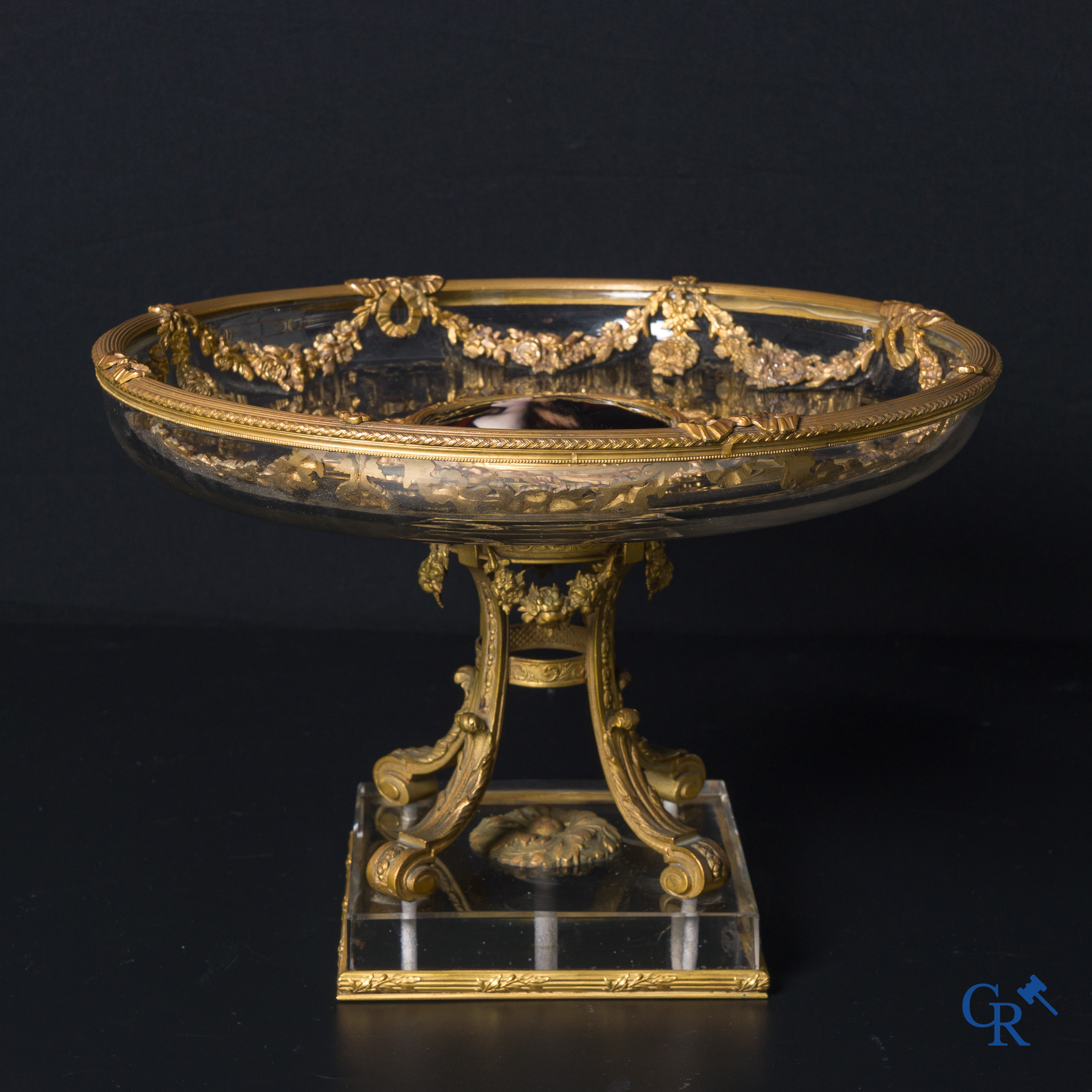 | Uitzonderlijke LXVI-stijl milieu de table in fijn vergulde brons, Limoges email en kristal. Circa 1920. |
