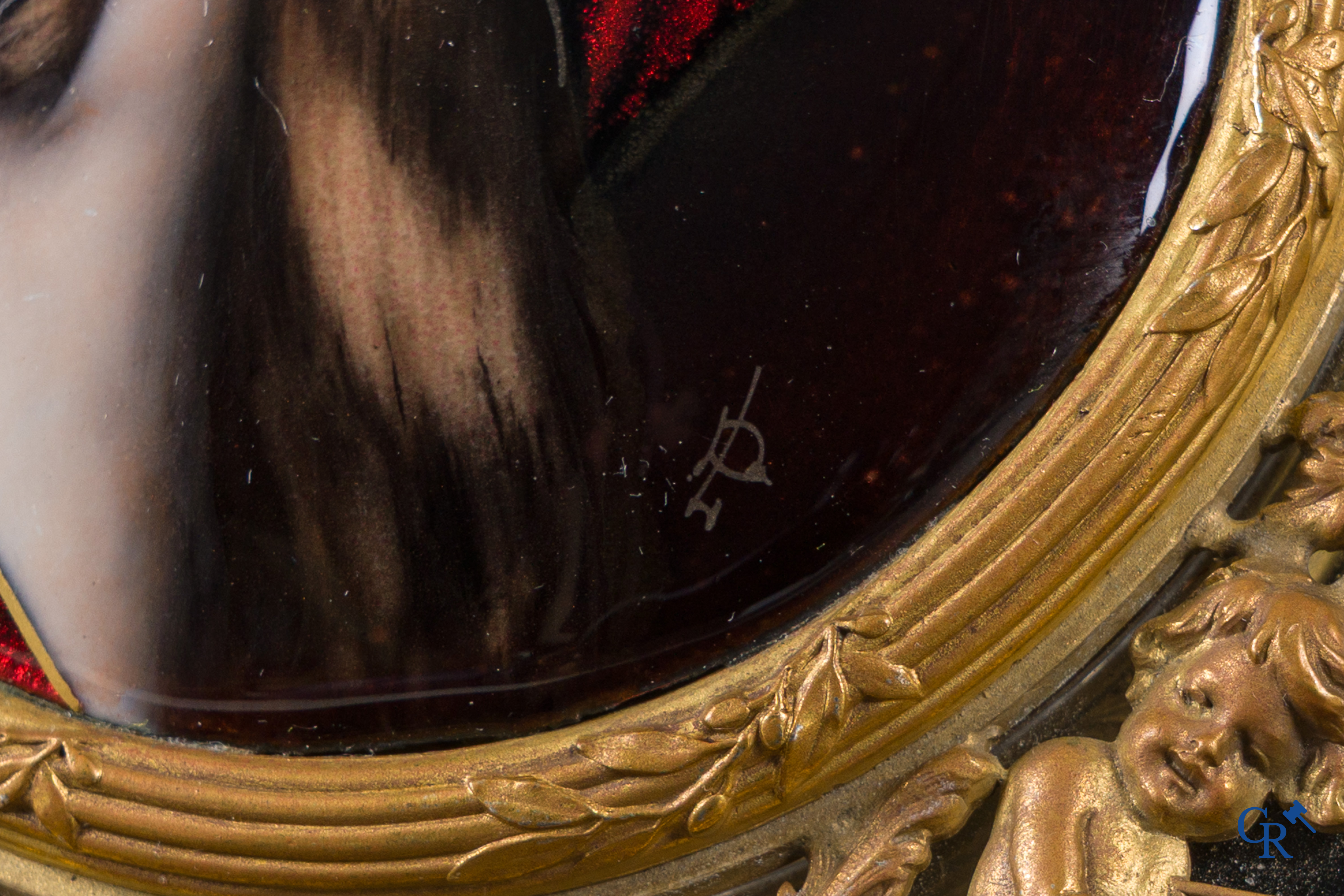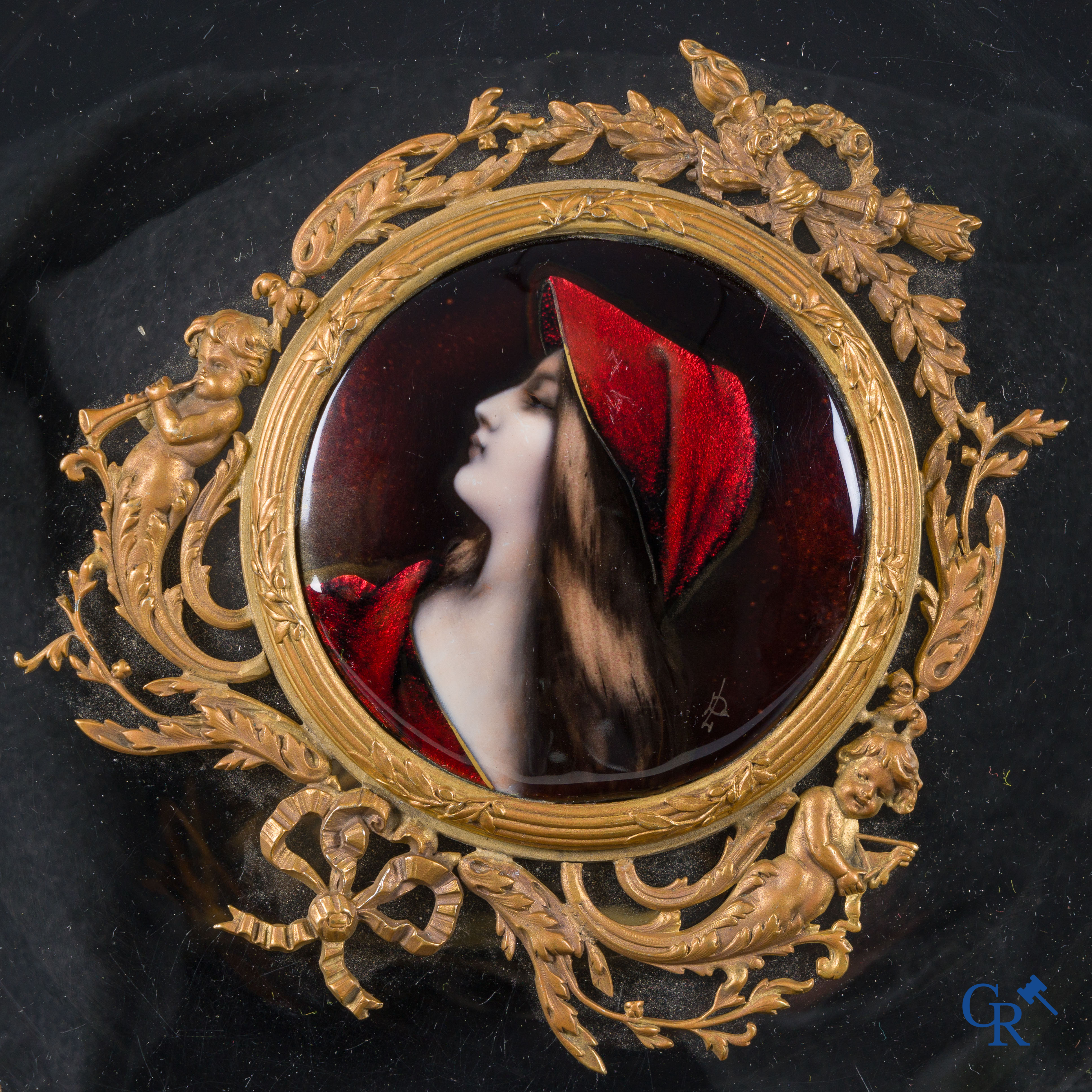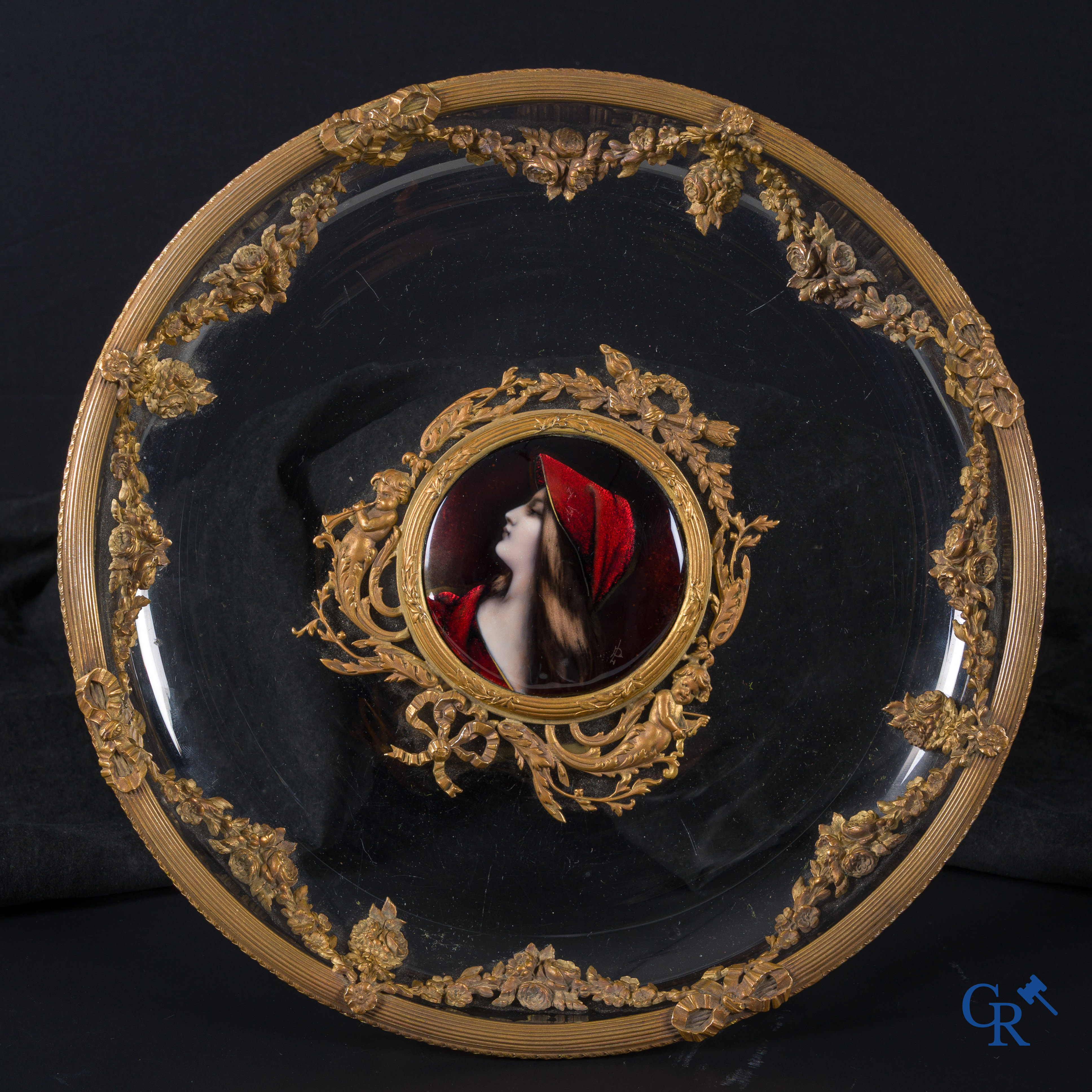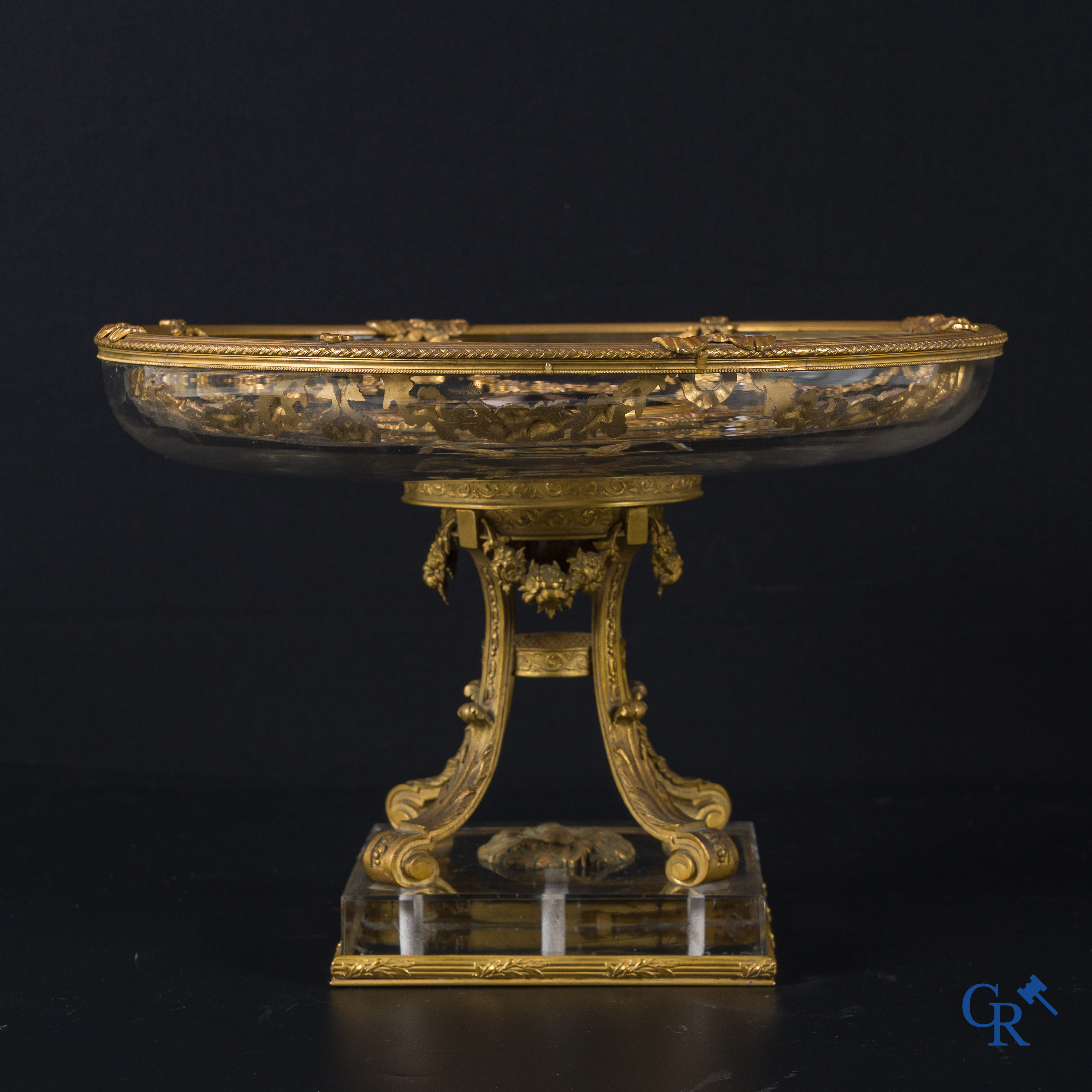 | Uitzonderlijke LXVI-stijl milieu de table in fijn vergulde brons, Limoges email en kristal. Circa 1920. |
