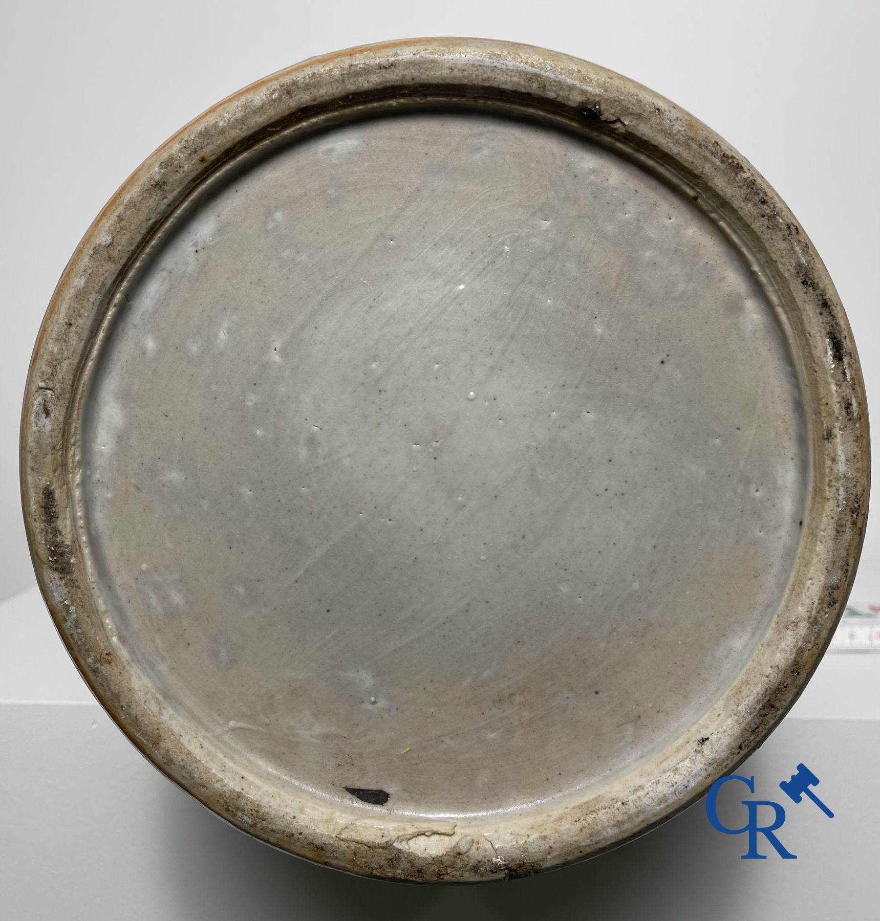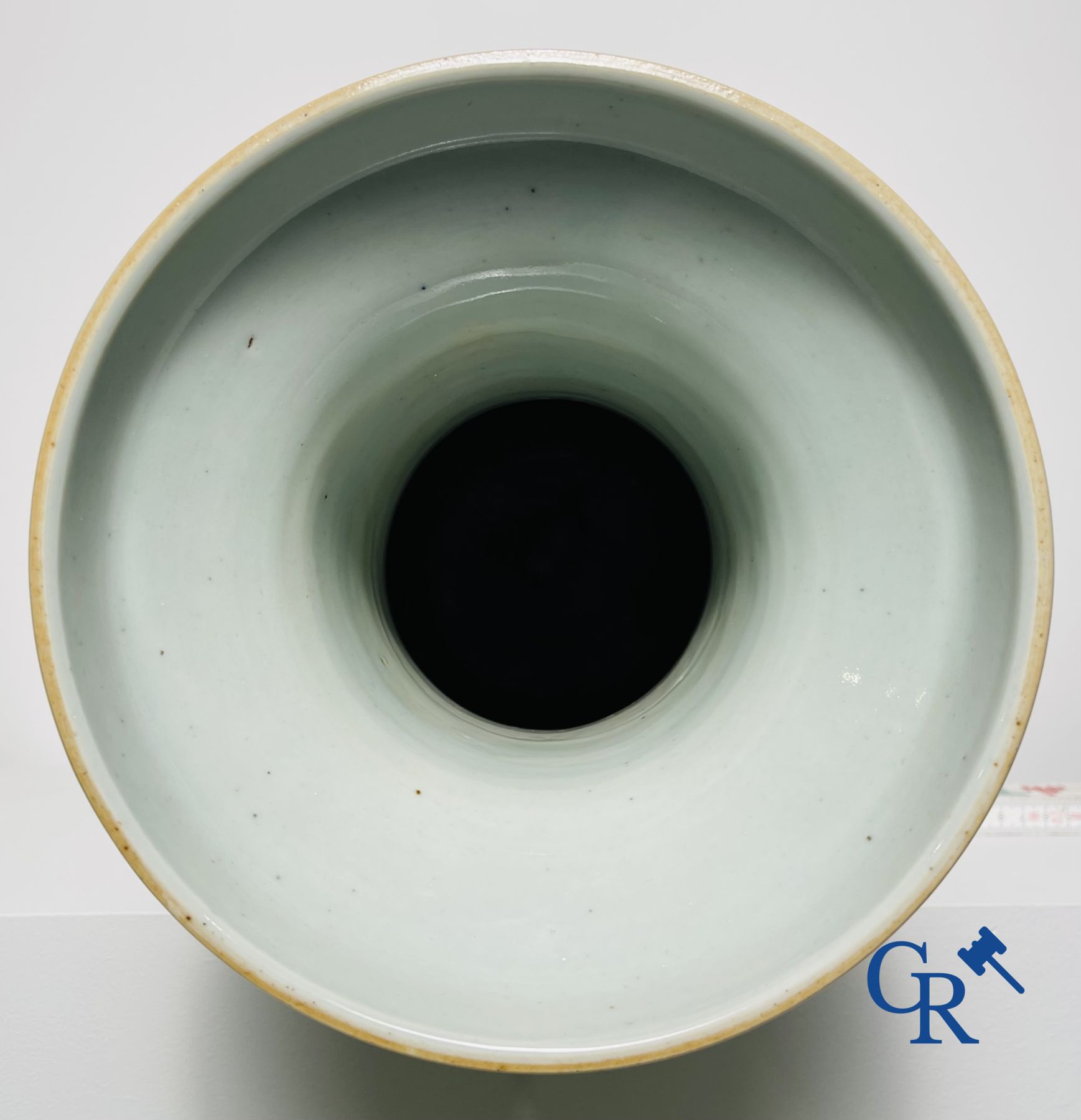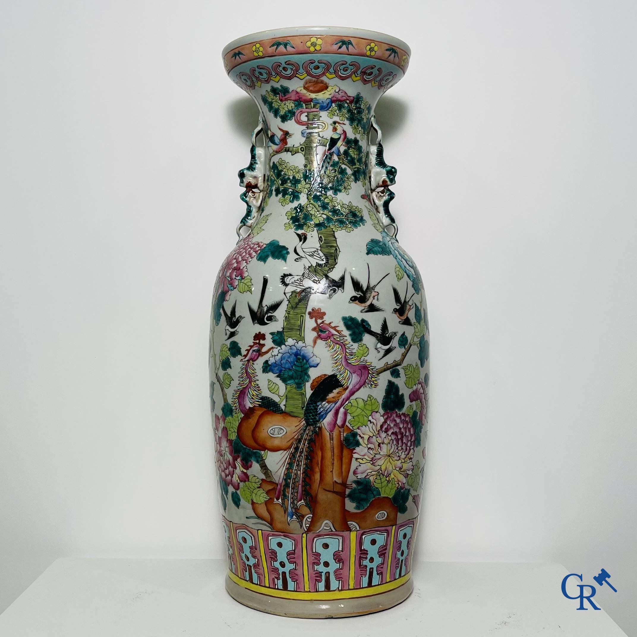 | Aziatica: Vaas in Chinees famille rose porselein met decor van fenixen, pauwen, mandarijneenden, witte Chinese kraanvogels en andere vogels in een omgeving van planten en pioenen. 19de eeuw. |